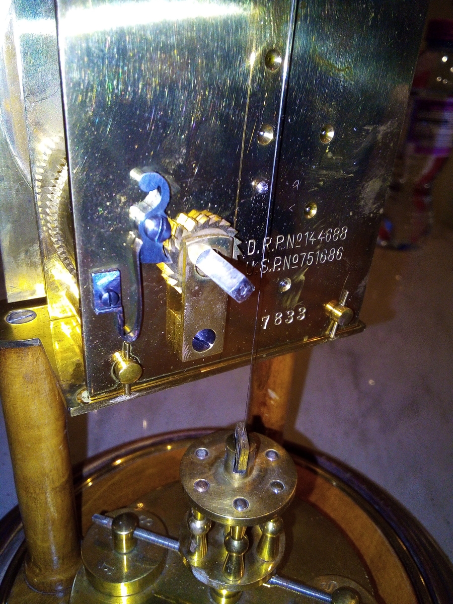 Ten mój, z tym wahadłem, pracuje od uruchomienia już ca 20 godzin i spóźnia się jakieś 20s. Bez żadnej regulacji. Powiesiłem wahadło, wyrównałem mniej więcej chód i tyle. Kręci równe 270 st., 2 mm nad podstawą. Ciężarki były prawie maksymalnie rozsunięte. Jakby idealnie do tego zegara pasowało (wahadło).