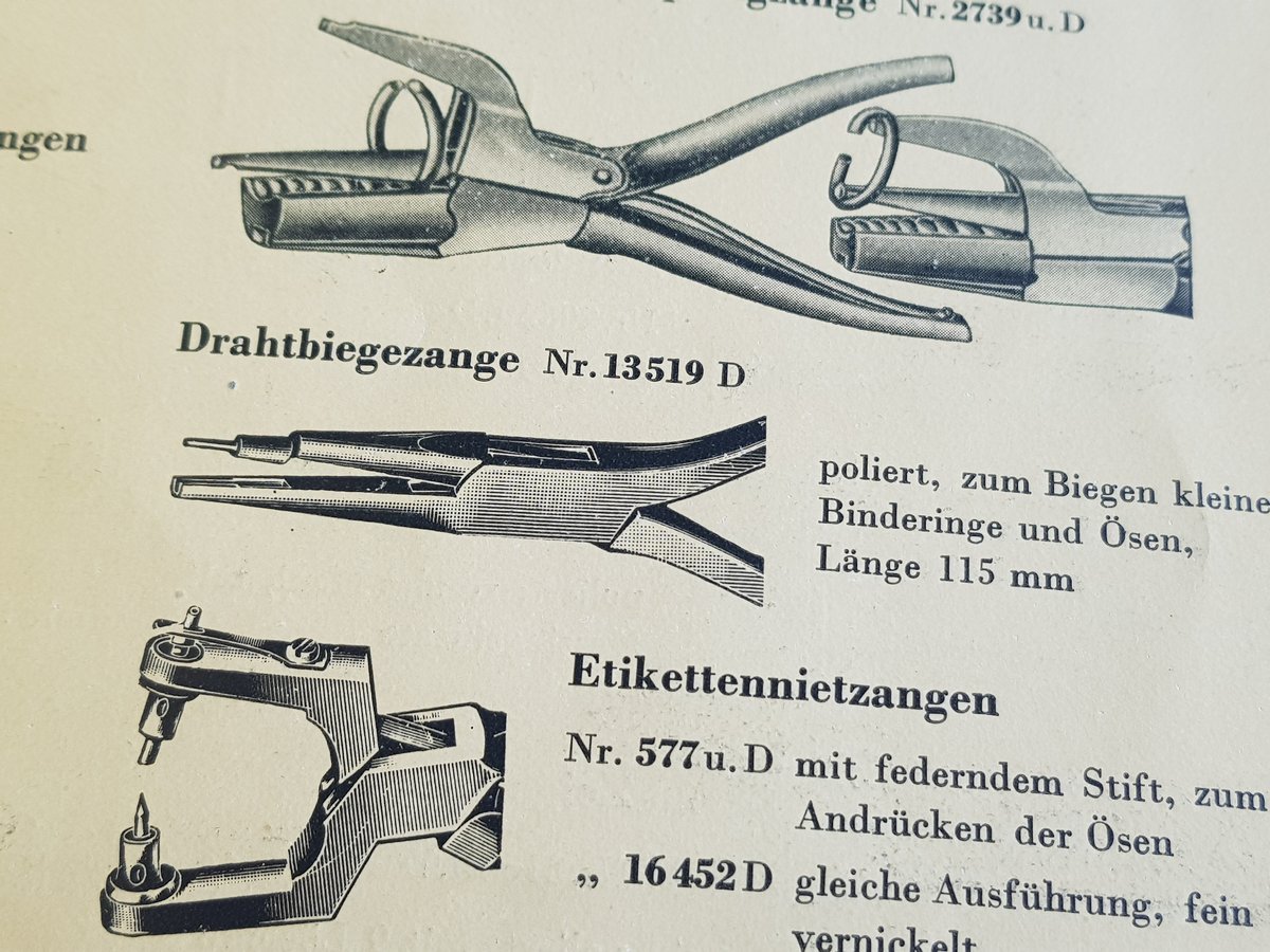 Grono szanownych Kolegów typowało wtedy różne zastosowania począwszy od słynnego "otwieracza do konserw" ;) do dziurkacza do biletów konduktora tramwajowego :) , a okazały się one własnie specjalistycznymi kleszczami do zaciskania oczek w metkach zegarmistrzowskich. i mógłby ktoś powiedzieć że fantazjuję ale dowodem na to okazał się katalog narzędzi zegarmistrzowskich z 1950 roku firmy Georg Jacob G.m.b.H.