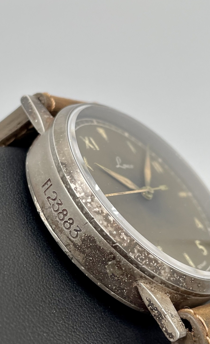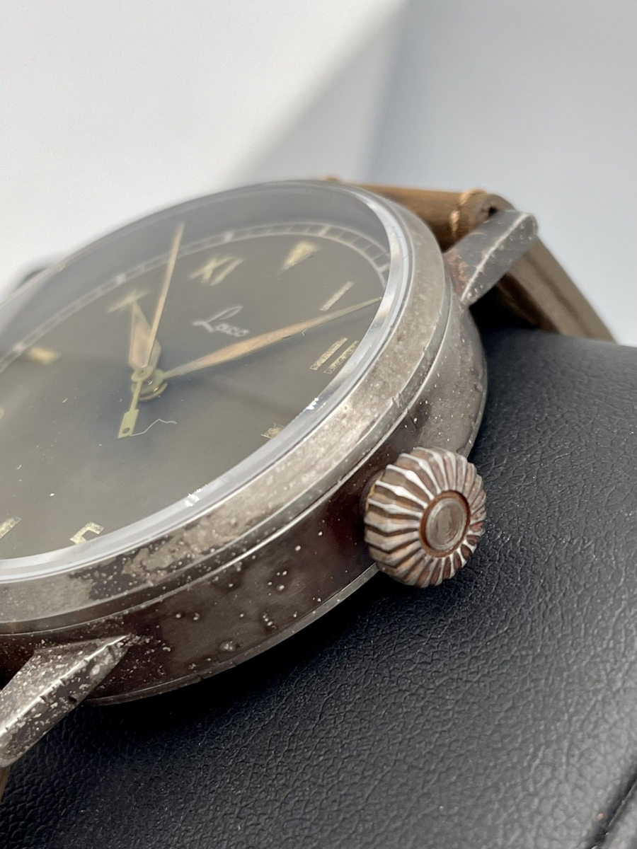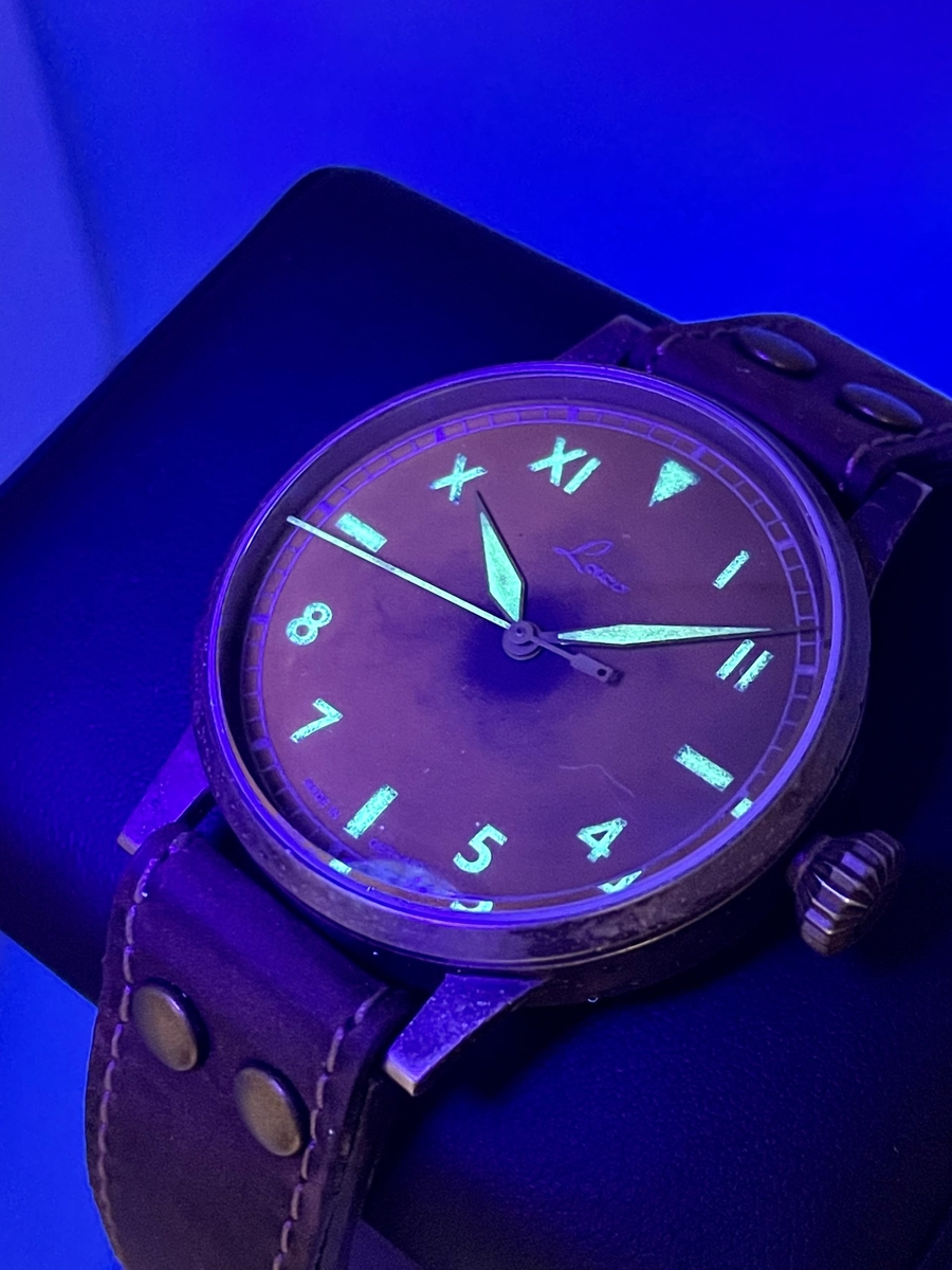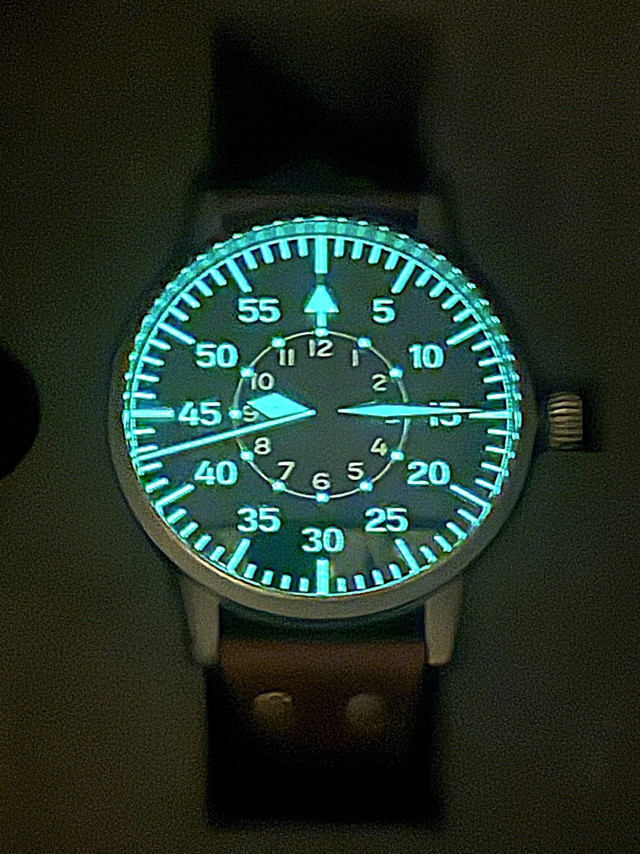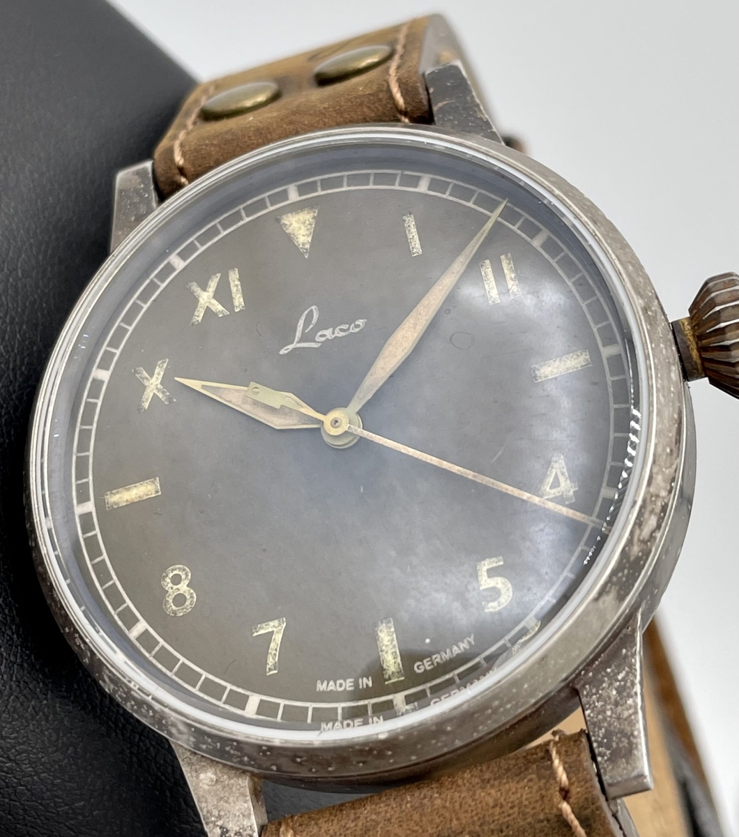 Pewnie wszyscy w Klubie Miłośników Laco wiemy, że Beobachtungsuhry typu B oficjalnie wprowadzono w roku 1941. W celu poprawy czytelności na tarczy nadrukowano dodatkowy, wewnętrzny okrąg godzinowy, a znaną z typu A zewnętrzną podziałkę godzinowo-minutową, zastąpił okrąg minutowy, z oznaczeniami liczbowymi stopniowanymi co pięć minut. Pierwotnie B-Uhry Baumuster B miały gładki okrąg wewnętrzny, bez punktów luminescencyjnych. Od początku roku 1945 wprowadzono kolejną zmianę i tarcza B była teraz dostępna z okręgiem godzinowym z naniesionymi luminescencyjnymi punktami. Odtąd wszystkie B-Uhry, które trafiały do fabryki Laco w celu naprawy lub serwisu, były wyposażane w tę tarczę - także te, które pierwotnie miały tarczę A bez okręgu godzinowego lub B z gładkim okręgiem. Prezentowany Laco ref. 861367 jest pierwszym powojennym B-Uhrem Laco Baumuster B z późniejszą tarczą, a więc ze świecącymi punktami na okręgu godzinowym. Lumę naniesiono tu na wszystkie minutowe indeksy liczbowe. Wygląda to lepiej, bo na tarczy więcej się świeci, ale nie jest to zgodne z historycznym oryginałem, w którym świeciły tylko liczby parzyste: 10, 20, 30, 40 i 50.