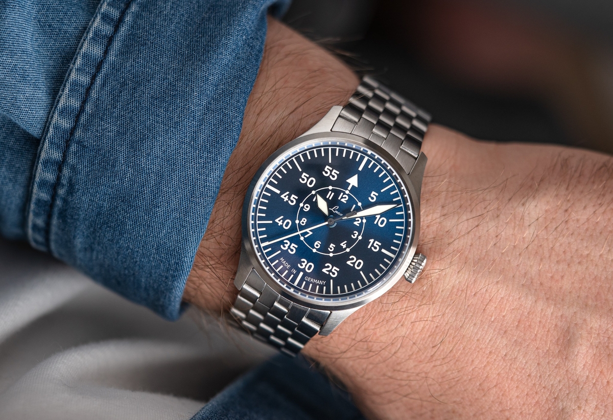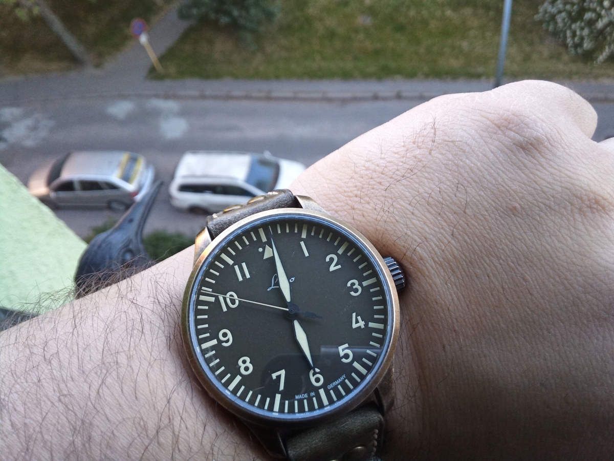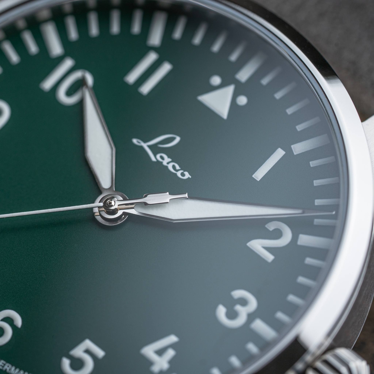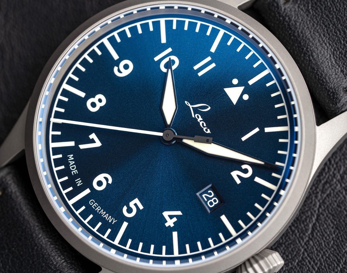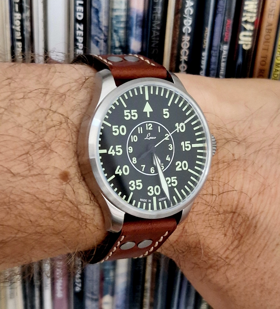 Nie jest to ortodoksyjny B-Uhr, więc logo i informacja o kraju pochodzenia nie rażą, a wręcz są OK. Wypukły szafir z AR w standardzie, na zamówienie może być obustronny AR. Genialna luma, WR200 i zakręcana koronka, trzy rozmiary do wyboru, tarcze A lub B, lewa lub prawa koronka, bransoleta lub pasek, szczotka lub szkiełkowanie, data lub nie - a jak tak, to czarna albo biała, i co tam jeszcze. Do wyboru, do koloru! Zielony pokazali kilka tygodni temu, teraz ten niebieski - dla mnie bomba. Może to świętokradztwo, ale gdybym miał wybierać lotnika EDC na bransolecie, który ma historyczne korzenie, to wolałbym Laco Pro niż IWC Big Pilot - choć w Laco tylko "satelita" cyka...  :P