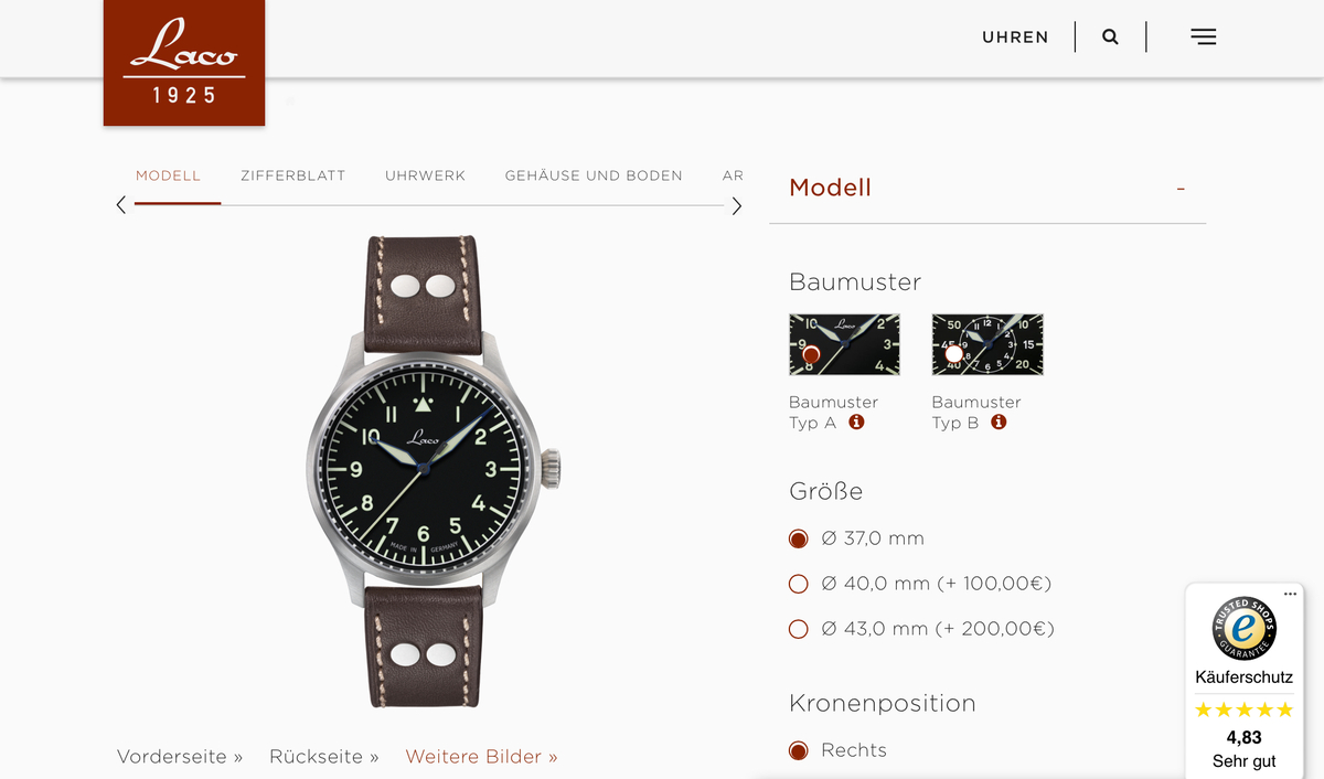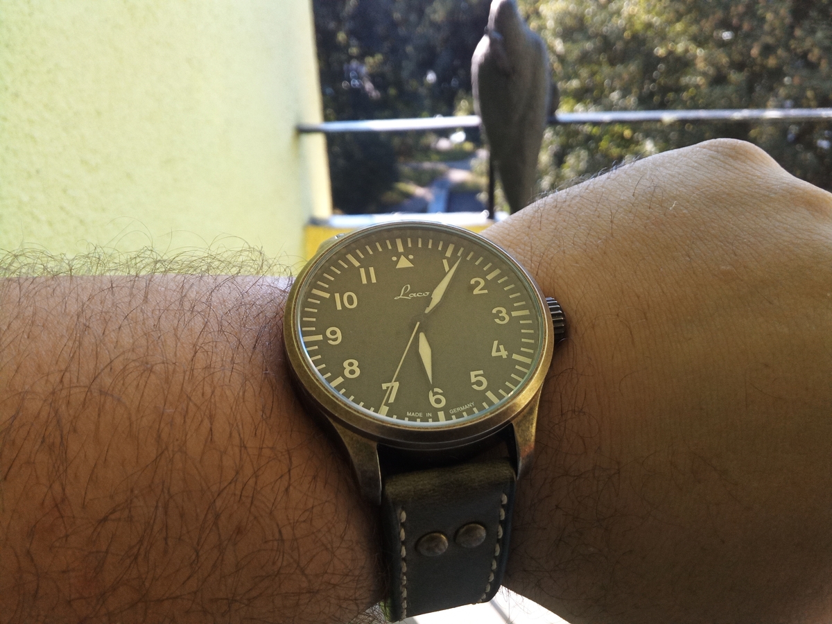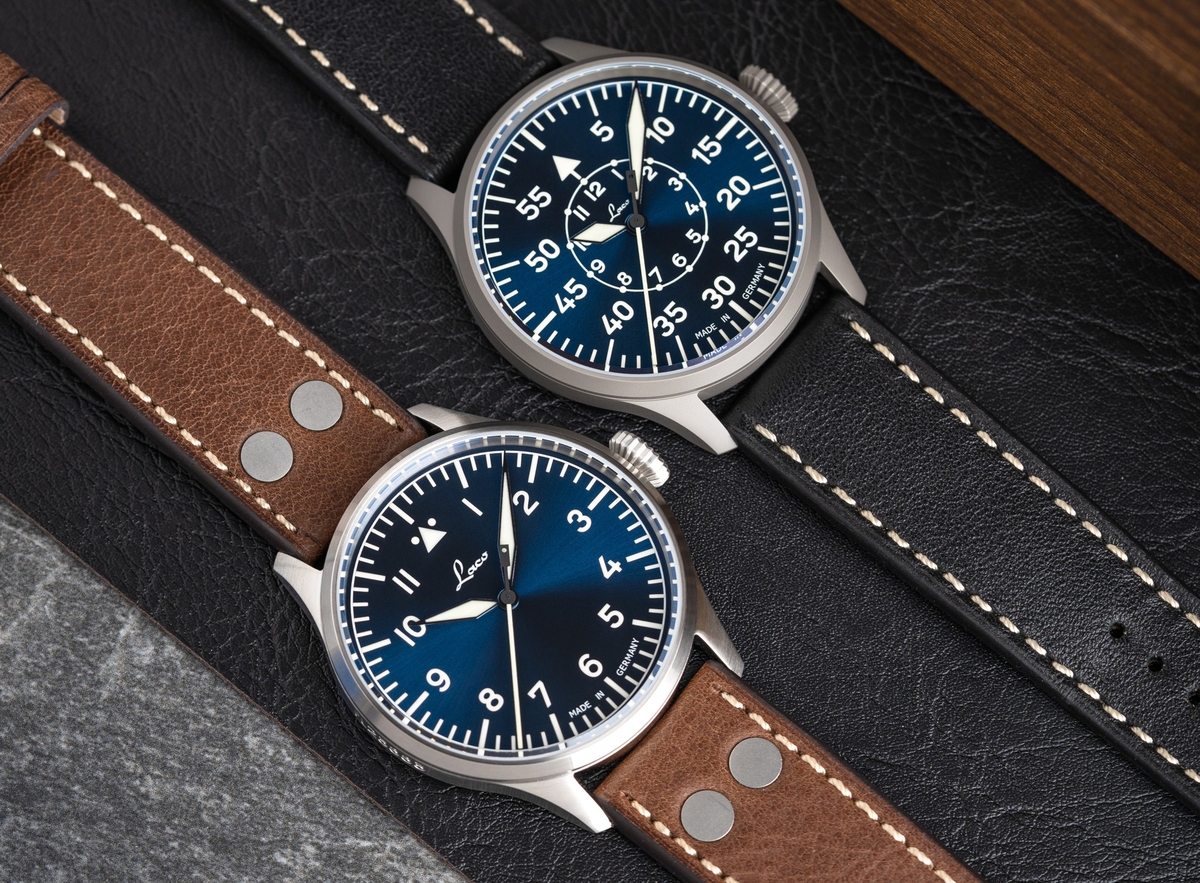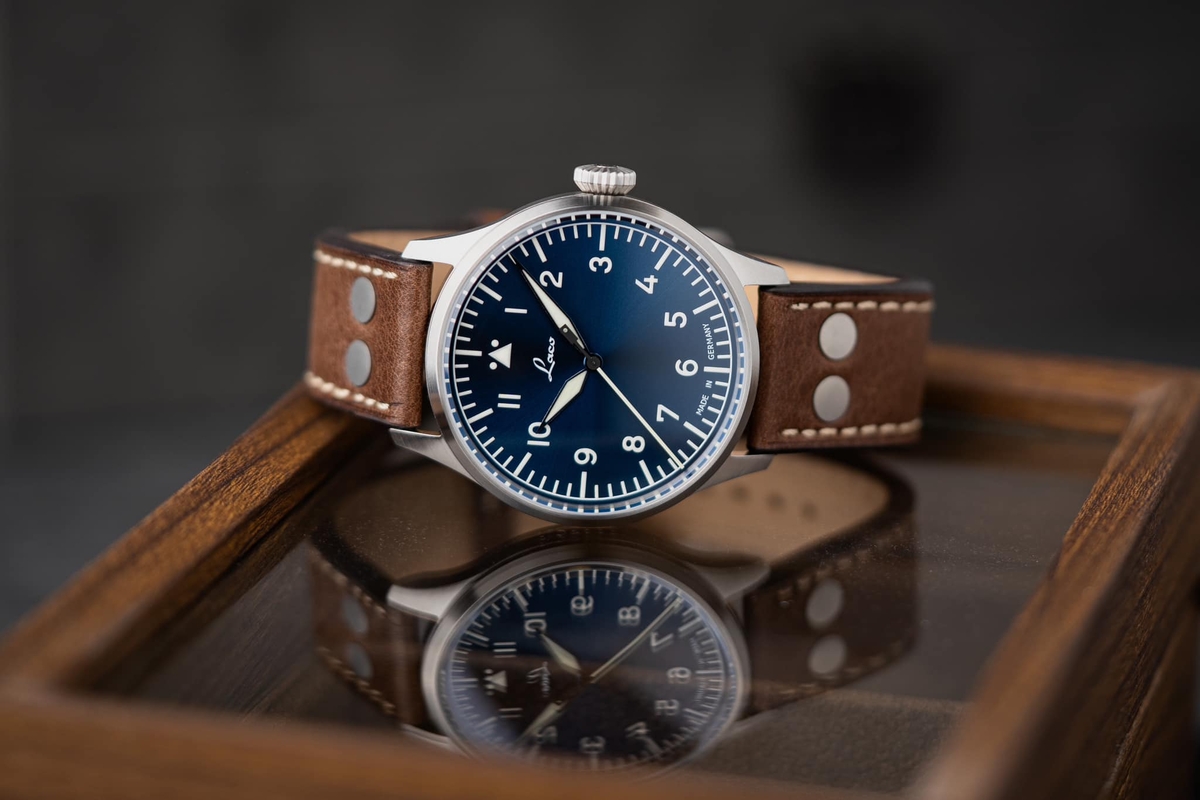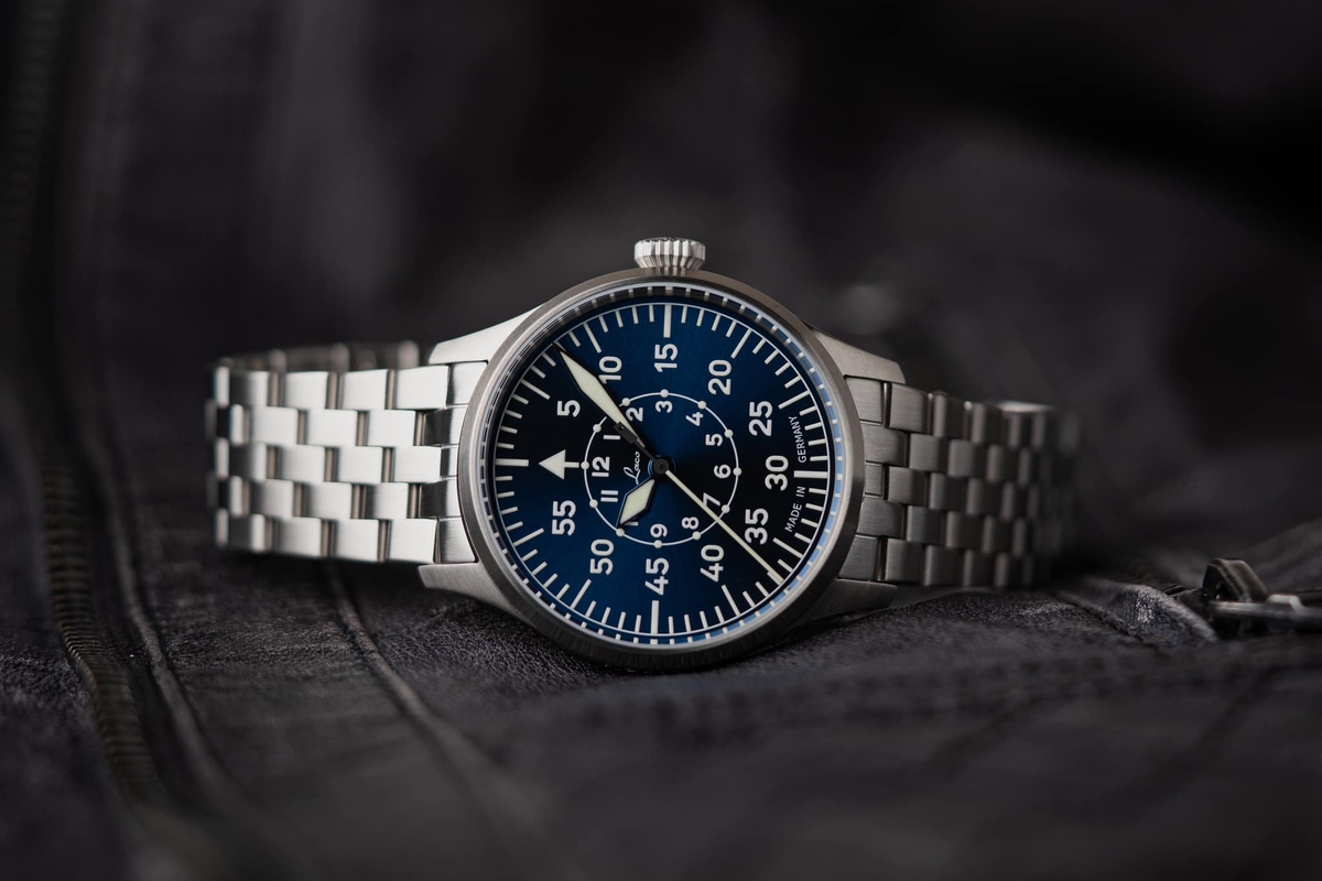 Nie jest to ortodoksyjny B-Uhr, więc logo i informacja o kraju pochodzenia nie rażą, a wręcz są OK. Wypukły szafir z AR w standardzie, na zamówienie może być obustronny AR. Genialna luma, WR200 i zakręcana koronka, trzy rozmiary do wyboru, tarcze A lub B, lewa lub prawa koronka, bransoleta lub pasek, szczotka lub szkiełkowanie, data lub nie - a jak tak, to czarna albo biała, i co tam jeszcze. Do wyboru, do koloru! Zielony pokazali kilka tygodni temu, teraz ten niebieski - dla mnie bomba. Może to świętokradztwo, ale gdybym miał wybierać lotnika EDC na bransolecie, który ma historyczne korzenie, to wolałbym Laco Pro niż IWC Big Pilot - choć w Laco tylko "satelita" cyka...  :P