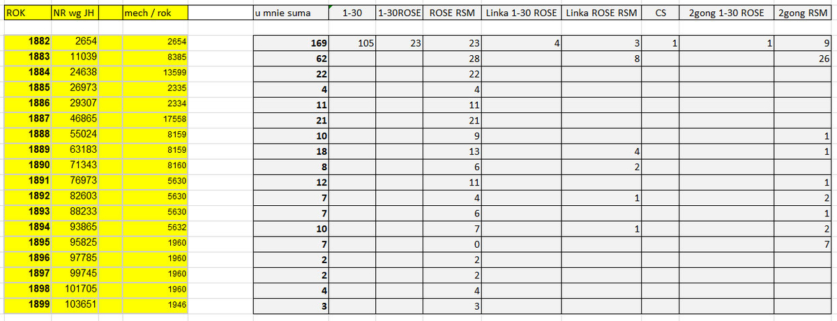 Yahagi 2305 #127 Napisano 29 Sierpnia 2021 ... nie mam pojęcia. Mam tylko te 2 zdjęcia tego mechanizmu. Tak dla porównania 2gong 539: Jeszcze parę zestawień.... zainspirowanych tym 'pchaniem' wszystkiego w rok 1882/3 Pierwsze (żółte) to założenia statystyczne wg JH. https://mb.nawcc.org/threads/rsm-rose-logo-schnekenburger-mühlheim.29370/post-822251 Ja mam świadomość, że one były montowane tak pi _x_ oko... i trzeba by je wygładzić, no ale orientacyjnie tak to wychodzi... To przybliżony numer dla określonego roku oraz roczna produkcja. Tabelka szara - to zasoby photo, które mam w archiwum. Biorąc pod uwagę wielkość produkcji wg JH - wychodzi taka krzywa. Założenie, które wydaje się być logiczne - im więcej mechanizmów wyprodukowano - tym więcej się ostało ... nie do końca pokrywa się to z niebieskim wykresem, bo wg kryteriów JH - zdecydowana większość mieści się w pierwszym i ewentualnie drugim roku produkcji. No i to wg mnie zupełnie nie trzyma się kupy... Jeśli ktoś ma pomysł jak to wytłumaczyć, że z pierwszego roku produkcji mam aż 169 mechanizmów ... a ze wszystkich pozostałych, razem wziętych ledwie 210 - no to ja jestem tym bardzo zainteresowany... 1 Udostępnij tę odpowiedź Odnośnik do odpowiedzi Udostępnij na innych stronach