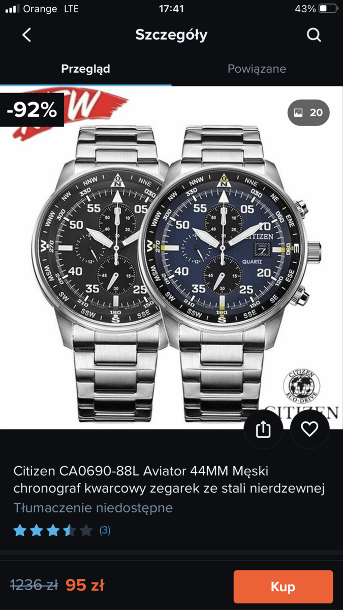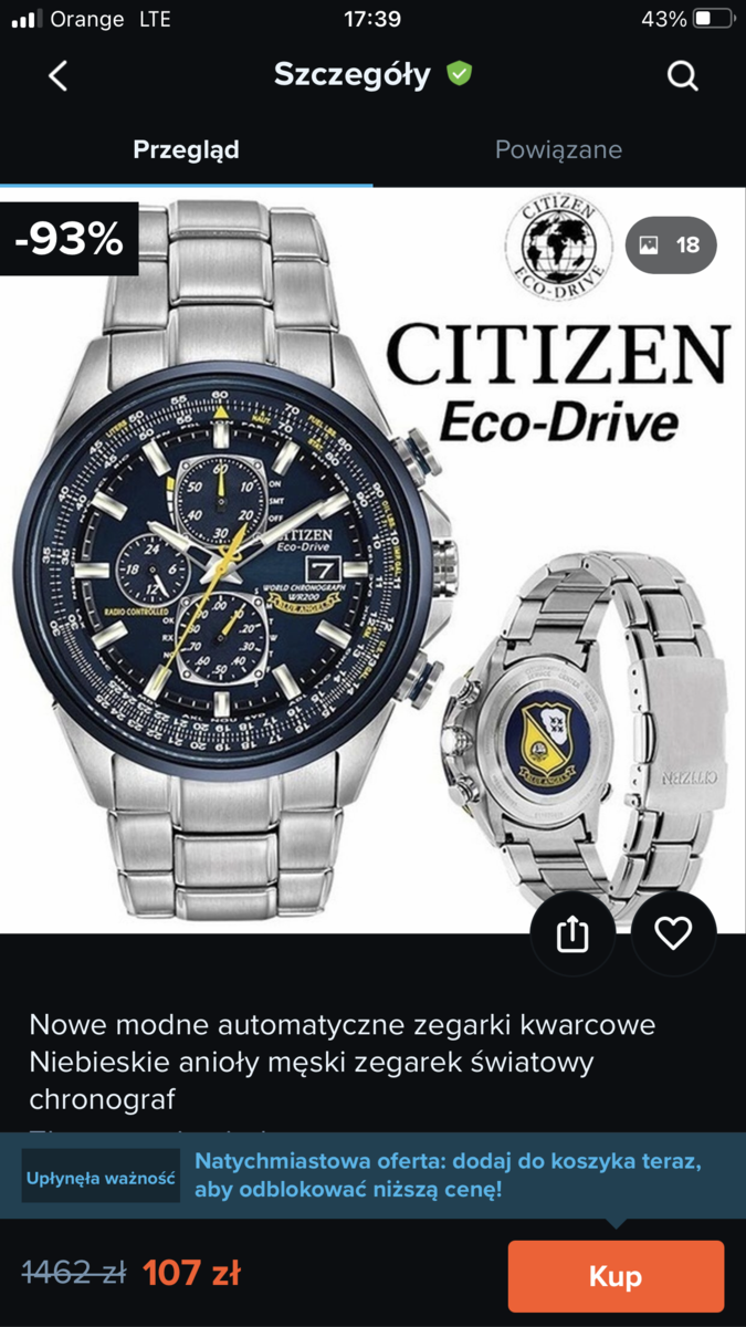 Teraz to aż strach używany zegarek kupić. Nigdy nie miałem citizena i ciężko mi jeszcze po foto odróżnić. Mam w kolekcji trzy Casio, dwa Orienty i Seiko. Teraz chciałbym Citizena. Jednak strach, że trafie na jakiś chiński badziew. Swoją droga lepiej kupić używany zegarek np Casio można wyrwać za 100-150 całkiem fajne niż podróbkę. Podróbka nie ma żadnej wartości, jakość wykonania pewnie tragiczna kolor zejdzie po paru tygodniach. Wyrzucanie pieniędzy w błoto.