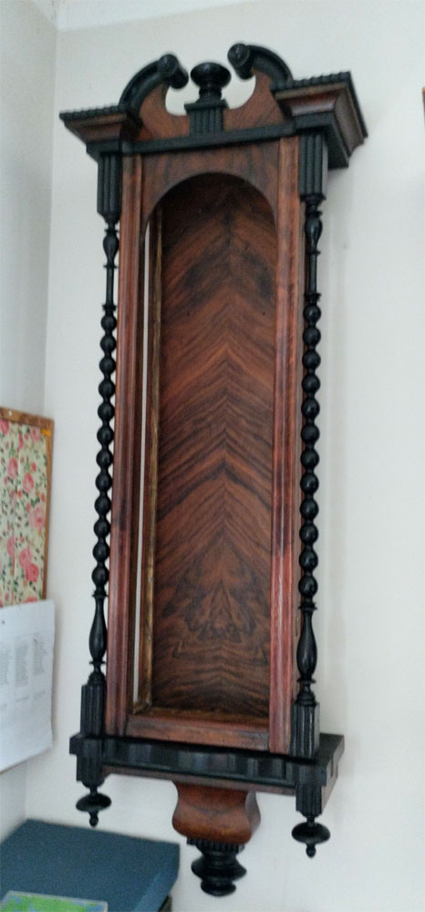 Willmann, wtórny w tej skrzyni. Ktoś okropnie krzywo nawiercił dziurki pod wieszak. Tak krzywo, że regulacja na stopie mi się skończyła, a zegar nadal krzywo wisi. Ale mechanizm w bardzo dobrym stanie... sporo lepszym niż skrzynia. Sterczyny muszą zaczekać na 500+ ... bo inaczej nie dam rady :)