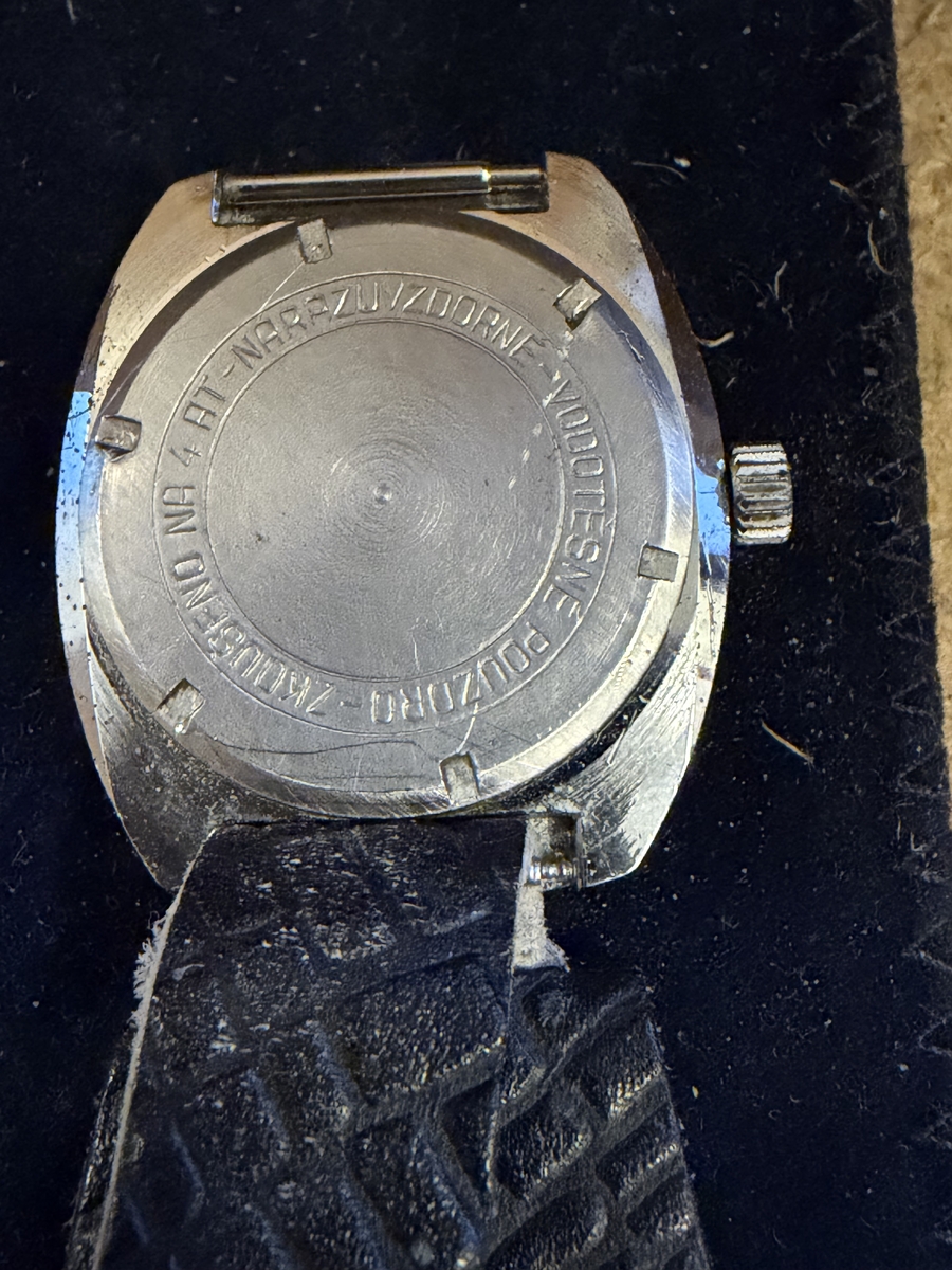 Mechanizm: Zegarek prawdopodobnie posiada mechanizm Vostok 2234 z naciągiem ręcznym i funkcją stop sekundy, która pozwala na zatrzymanie wskazówki sekundowej w celu precyzyjnego ustawienia czasu (stop sekunda działa). Zegarek na chodzie, datownik także działa. Zegarek z niebieską tarczą z czerwoną gwiazdą nad godziną szóstą oraz okienkiem datownika na godzinie trzeciej. Szkło akrylowe z widoczną rysą nad godziną 6.