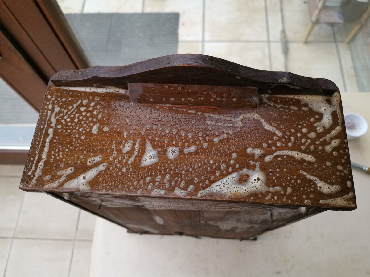 Nie wiem. Nie znam sie. Poniewaz wrobilem sie w mozliwosc eksperymentowania postanowilem teraz potraktowac skrzynke czysta terpentyna a potem czystym alkoholem etylowym.