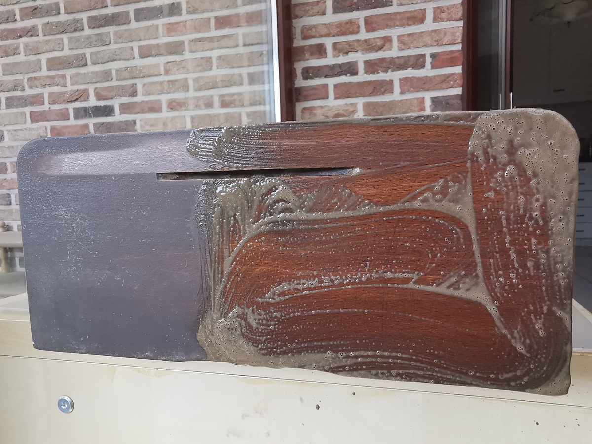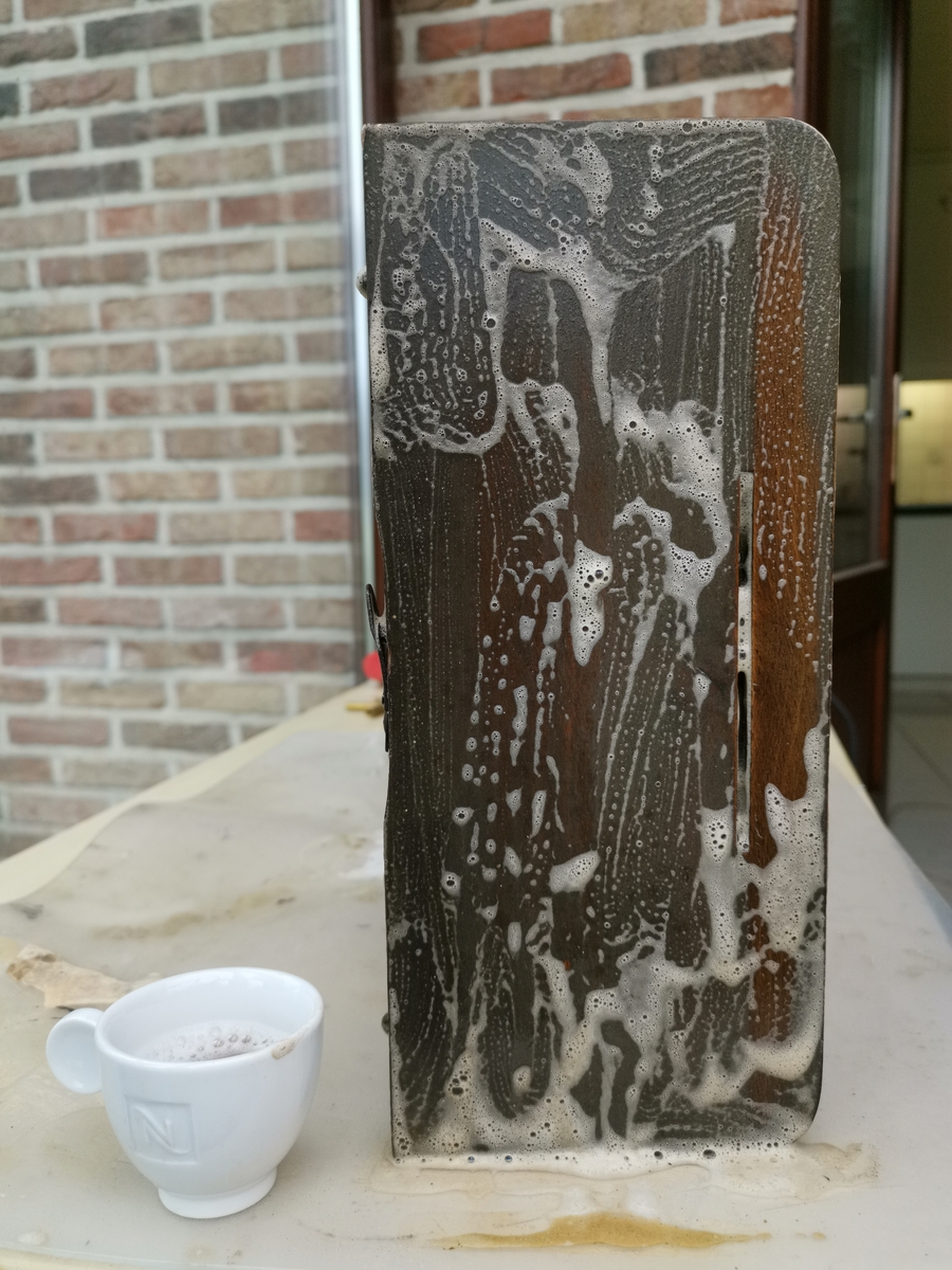 Prawa czesc gory skrzynki szorowalem pedzelkiem - tym samym, ktory pokazywalem wczesniej - a potem mokra ( od wody ) szmatka przetarlem.