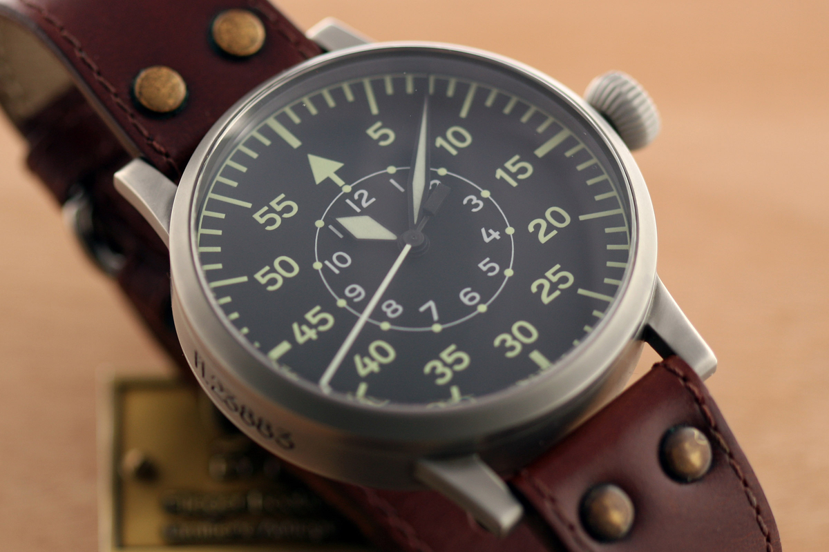 Laco B z czarną tarczą i czarnymi obwódkami wskazówek - tutaj czerń obwódek nie jest taka ortodoksyjna, kruczoczarna: