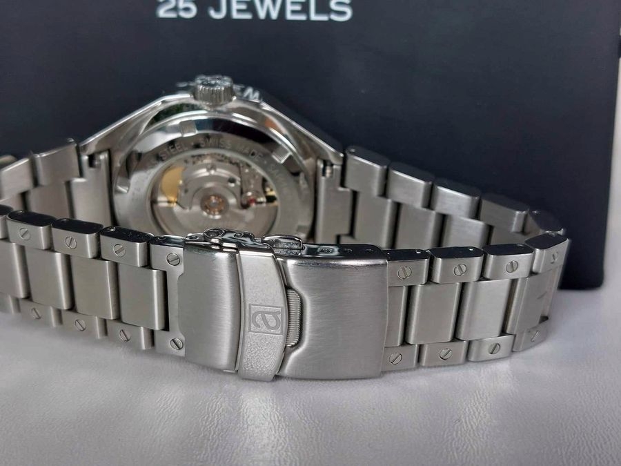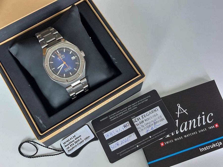 Cena 2900 + koszt wybranej wysyłki Stan 7/10 Ocean7 to marka specjalizująca się od lat w profesjonalnych zegarkach do nurkowania. LM-1 jest tego idealnym przykładem. To zegarek duży, wyjątkowo czytelny w każdych warunkach, solidny, świetnie wyglądający na odpowiednim nadgarstku. Do tego świetnie wykonanym i na szwajcarskim mechanizmie. Świecenie wskazówek i indeksów jest mocniejsze i dłuższe niż w Seiko Monster, wytrzymuje faktycznie 8 godzin. Bransoleta nie odbiega jakością wykonania i materiałem od samego zegarka, ogniwa są zakręcane a klamra z podwójnym zapięciem to także solidny kawałek stali. Na szczęście nie zapomniano o kilku fajnych smaczkach, ale te nowy właściciel niech sobie sam poszuka Specyfikacja: Koperta: stal nierdzewna 316L piaskowana Wymiary: szerokość 45 mm, od ucha do ucha (L2L) 56,6 mm, grubość 17,4 mm Szkło: szafirowe z wewnętrzną powłoką AR, podwójnie kopułkowe Wodoodporność: 300 metrów (1000 stóp) Mechanizm: szwajcarski automatyczny z komplikacjami daty Ramka: jednokierunkowa, 120 kliknięć, 60 minut, zdejmowana na cztery śruby Szerokość ucha: 24mm Tarcza: wskazówki i indeksy Super-LumiNova. Wyświetlanie daty Zakręcana koronka i dekiel koronkę Waga: 170 gramów na pasku Bransoleta: stal 316L piaskowana W komplecie: dwa pudełka, dodatkowe ogniwa bransolety, dwa, dodatkowe bezele, dokumenty. Stan mechaniczny: bez zastrzeżeń, zegarek na punktualnym chodzie, w 100% sprawny Stan wizualny: zegarek jest używany i nosi tego bardzo niewielkie ślady – kilka na bransolecie i jedno na klamerce. Gwarancja: 1 rok