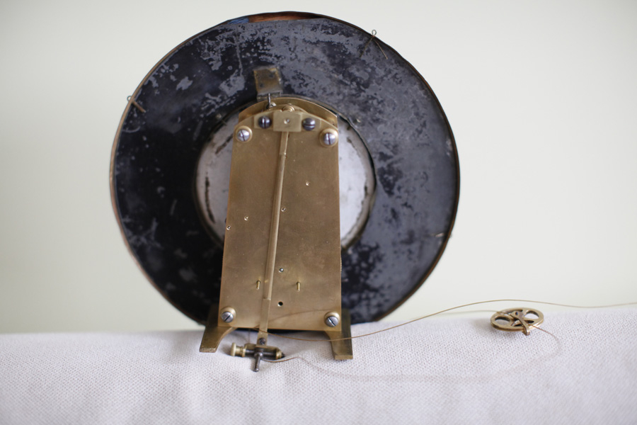 wykwity korozji na mosiądzu. Soczewka wahadła pogięta. Skrzynia wymaga troski, ubytki, spojenia gdzieniegdzie puściły.