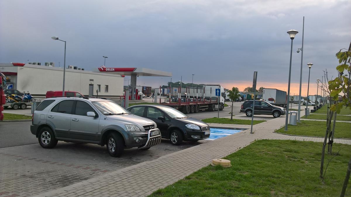 Trasa S8, za Wrockiem na Warszawę. Pierwsza stówka pekła i poranna przerwa na śniadanie. W oddali czarna kijana szwagra. Konwój na trzy fury.