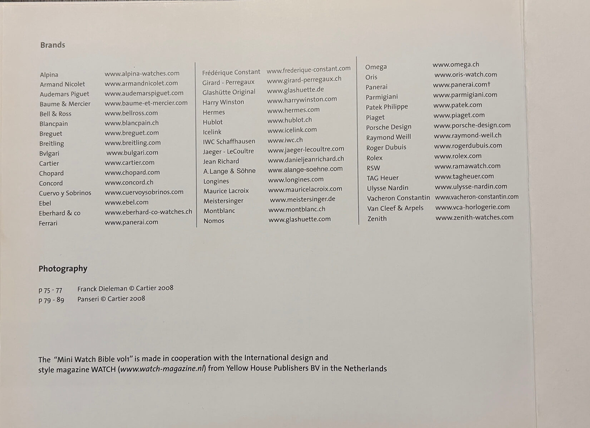 Lista firm, których zegarki zostały przedstawione na łamach albumu, pokazana została na ilustracji