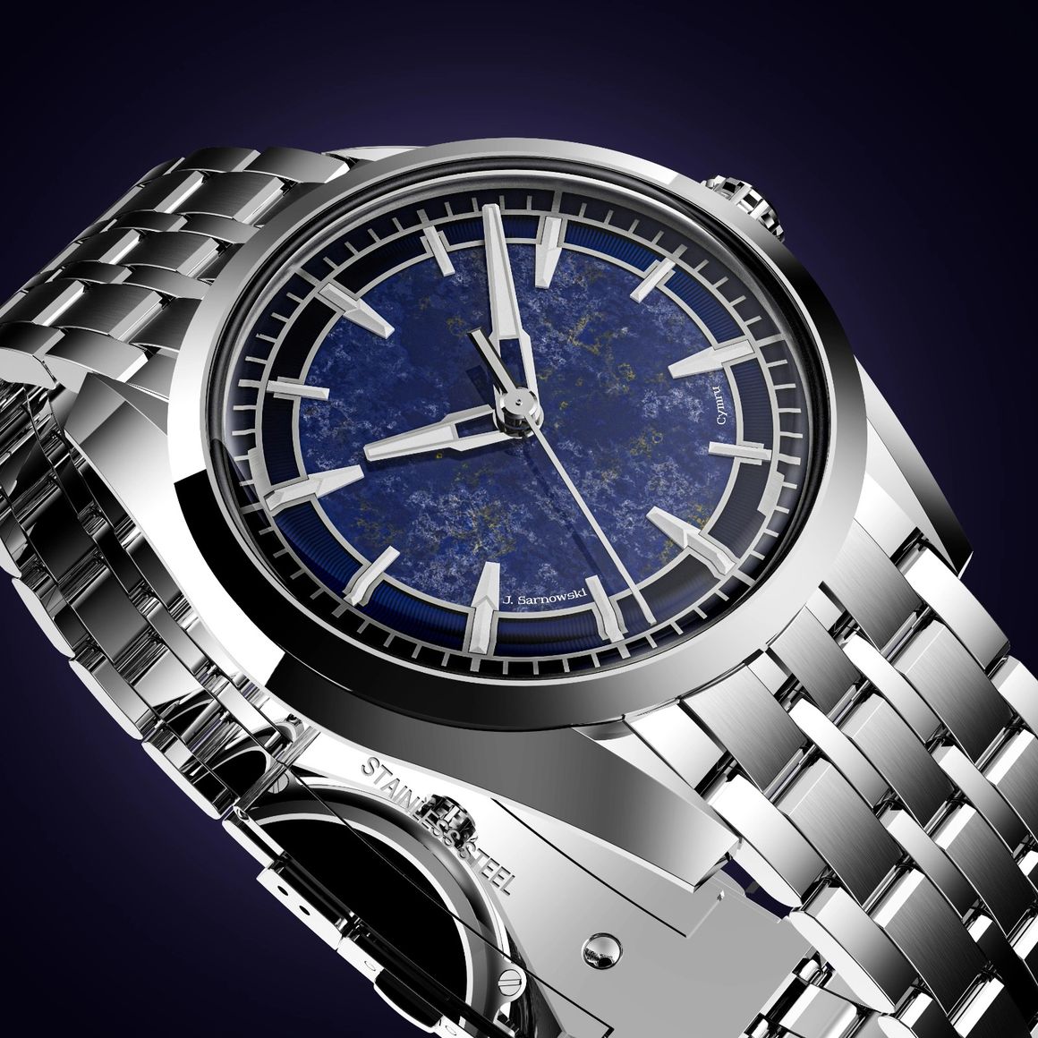 - Miyota 9039 movement with custom bridges (featuring the Welsh dragon engraved onto the balance cock) and a unique rotor
