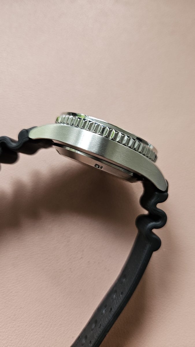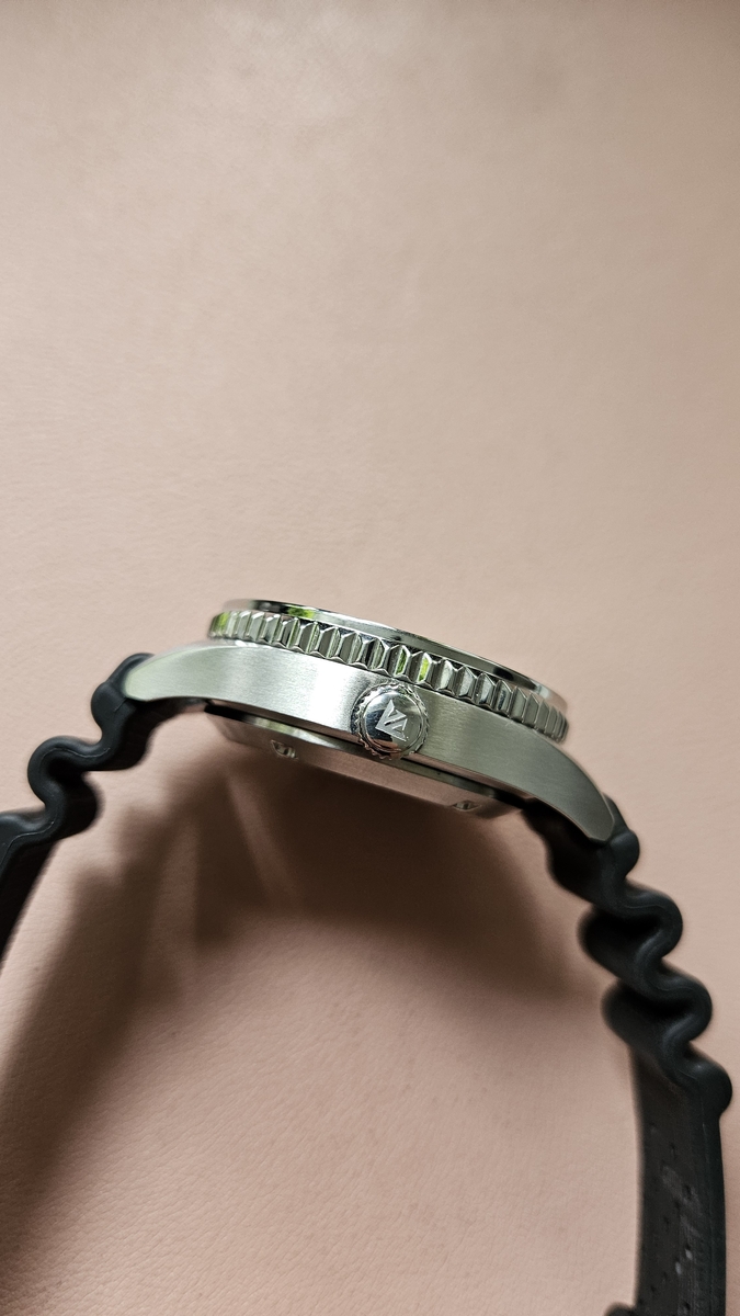 Mechanizm automatyczny, Miyota 8204 z stopsekundą i dokręcaniem, wr200, zakręcana koronka, szerokość koperty 41mm, między uszami 20mm.