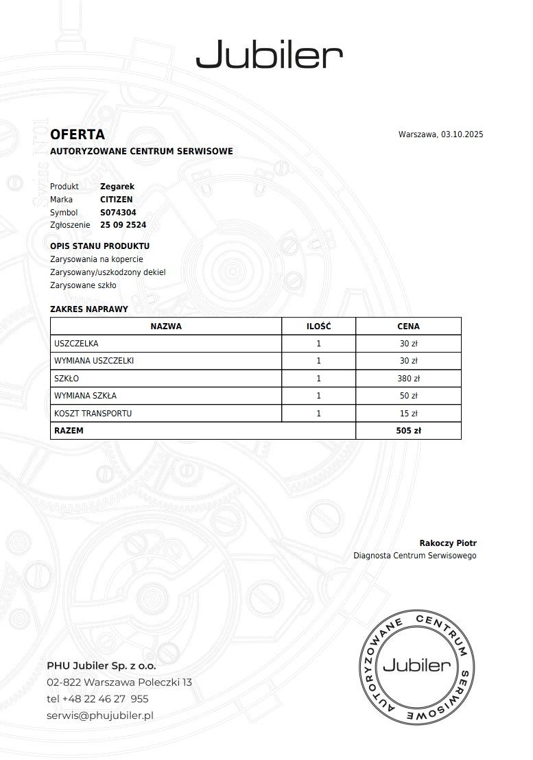 tommly 11518 #24 Napisano Niedziela o 11:00 W dniu 3.10.2025 o 14:19, beriam napisał(-a): Wysłałem obywatela dwa tygodnie temu do serwisu, dziś przyszła wycena. Biorąc pod uwagę cenę szkła, chyba dam sobie spokój i spróbuje żyć ze skazami na szkle obecnym Wg mnie nie ma tragedii. Niestety teraz wszystko jest drogie, tym bardziej szafir, bo chyba takie tam siedzi. A co powiesz na 4000 zł za szkło do Longinesa chrono, to jest dopiero masakra. 0 ..."Wszystko jest możliwe. Niemożliwe po prostu wymaga więcej czasu"... Dan Brown Udostępnij tę odpowiedź Odnośnik do odpowiedzi Udostępnij na innych stronach
