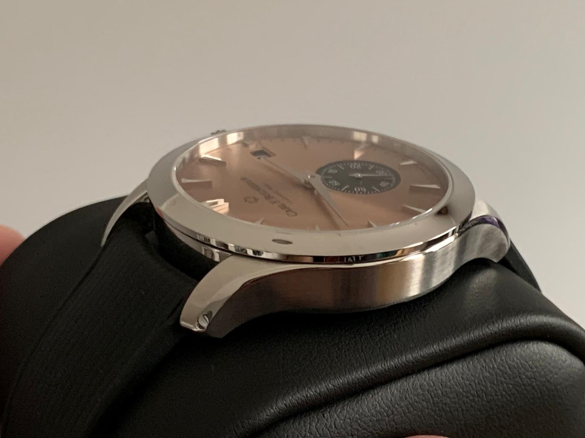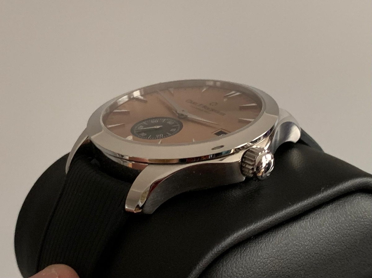 - piękna estetyka, tarcza łososiowa, zegarek jest wykończony satynowaniem , obłymi przejściami i ciemnym rodowowaniem, zegarek prosty i unikalny,