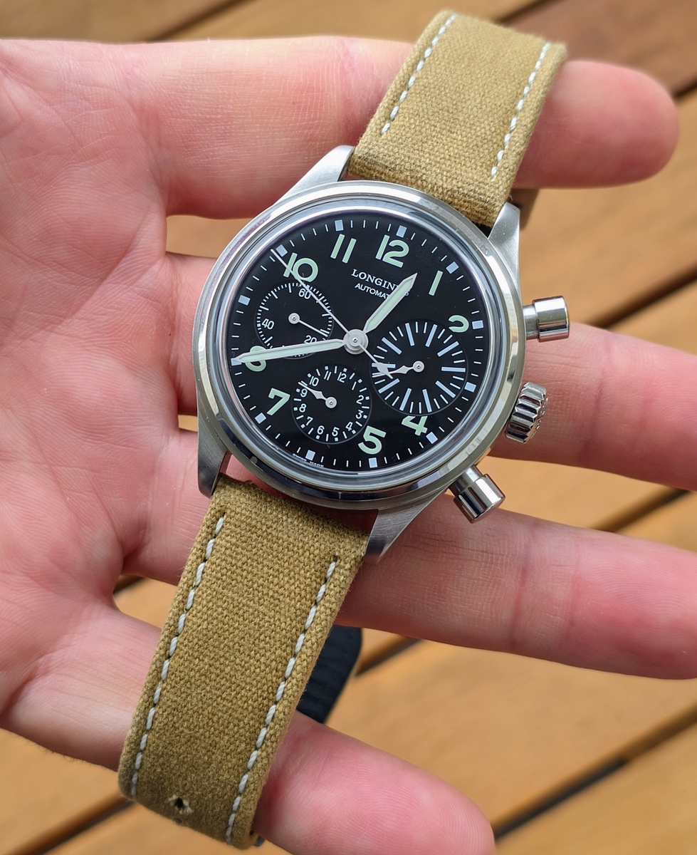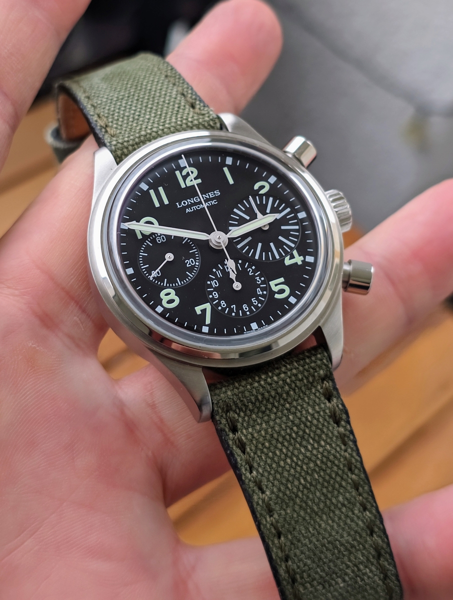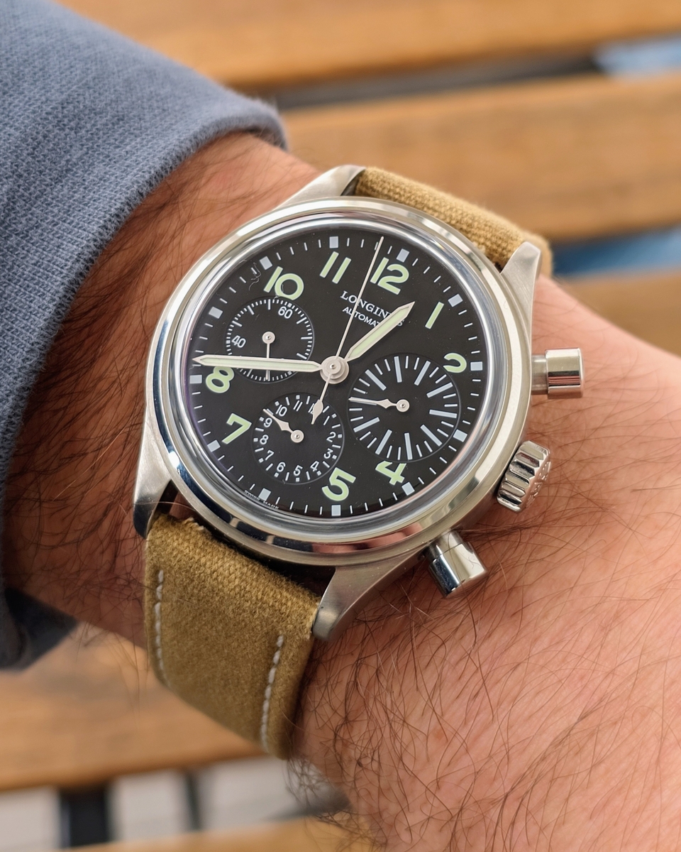 W 2000 r. Eterna wprowadziła model mocno nawiązujący do swoich dawnych zegarków dla pilotów. Air Force I w klasycznej linii Les Historiqus to zegarek w rozmiarze 37 mm (bez koronki) i mający jedynie 9 mm grubości. Warto zwrócić uwagę na grubość zegarka, bo w środku kopery został zamknięty automatyczny mechanizm ETA z komplikacją daty i dość wysokim wewnętrznym bezelem. Na uwagę zasługuje wyjątkowa czytelność zegarka a fajnym smaczkiem jest ciemna czerwień sekundnika i trójkąta na bezelu. Bezel, jak przystoi na zgarki lotnicze, obraca się w obie strony. Koronka od bezela jest dyskretnie schowana w kopertę, praktycznie się z nią licuje. Zegarek jest używany, ale w pięknym stanie zachowania, na polerowanych bokach jedynie minimalne, „mankietowe” ślady używania. Szkło i dekielek czyste, więc jak na 25-cio letni zegarek to wyjątkowy egzemplarz. W komplecie jest także pudełko i oryginalny, ale podniszczony pasek, który został zastąpiony świetnym paskiem z naturalnej skóry w stylu pasków do pilotów. Do tego paska została założona oryginalna klamerka. Mechanicznie zegarek jest w perfekcyjnym stanie, na równym, bardzo ładnym chodzie, miło posłuchać.