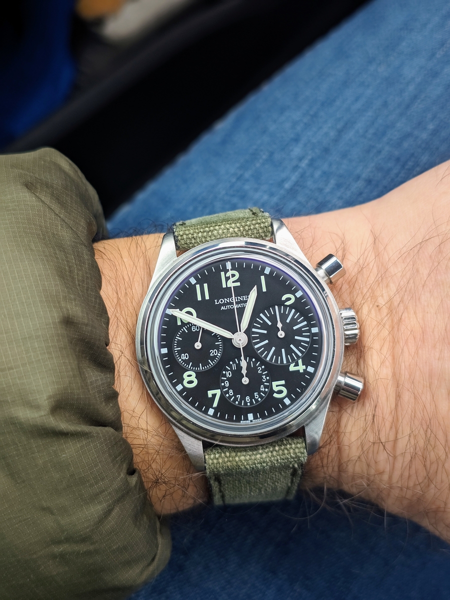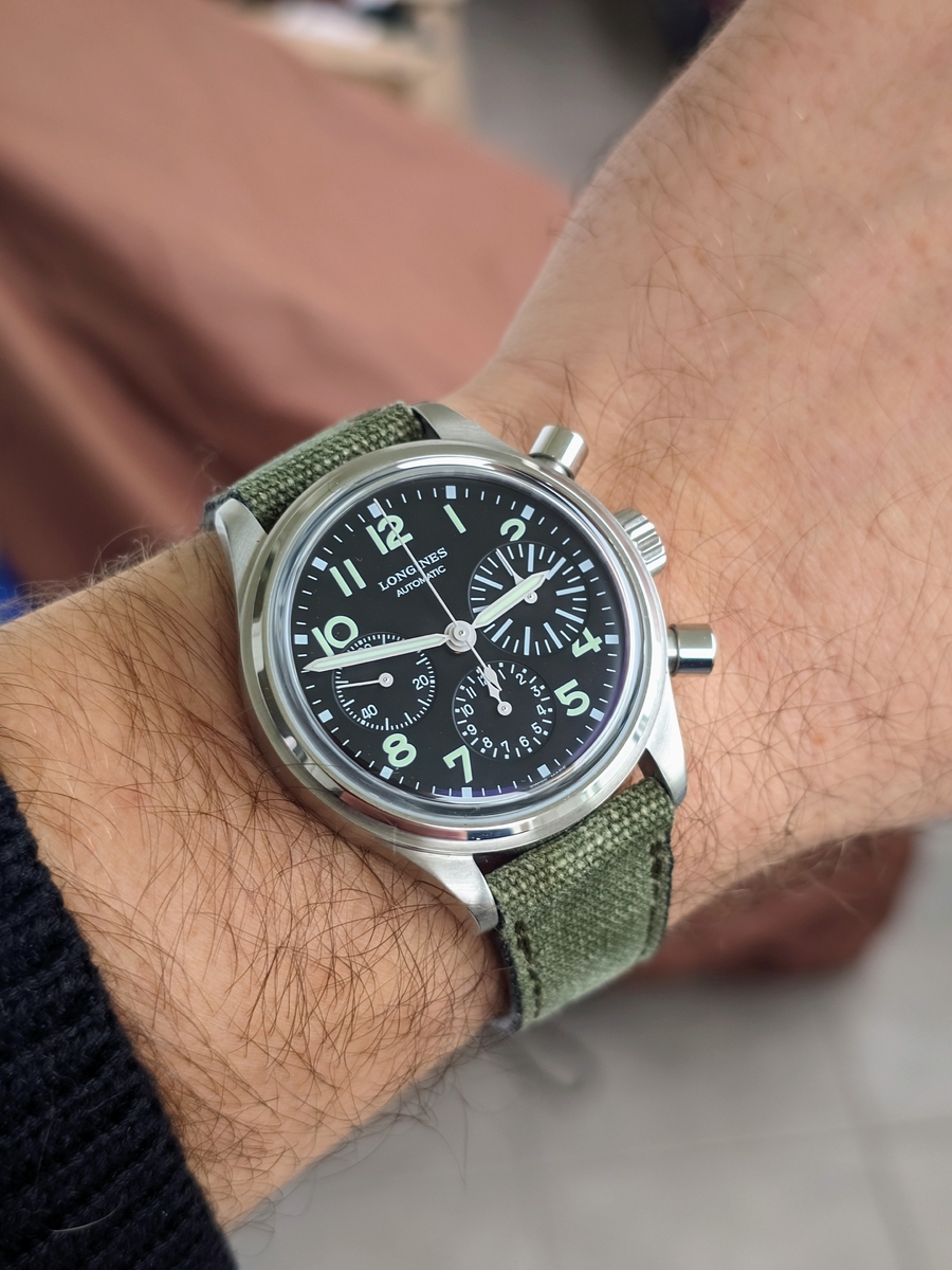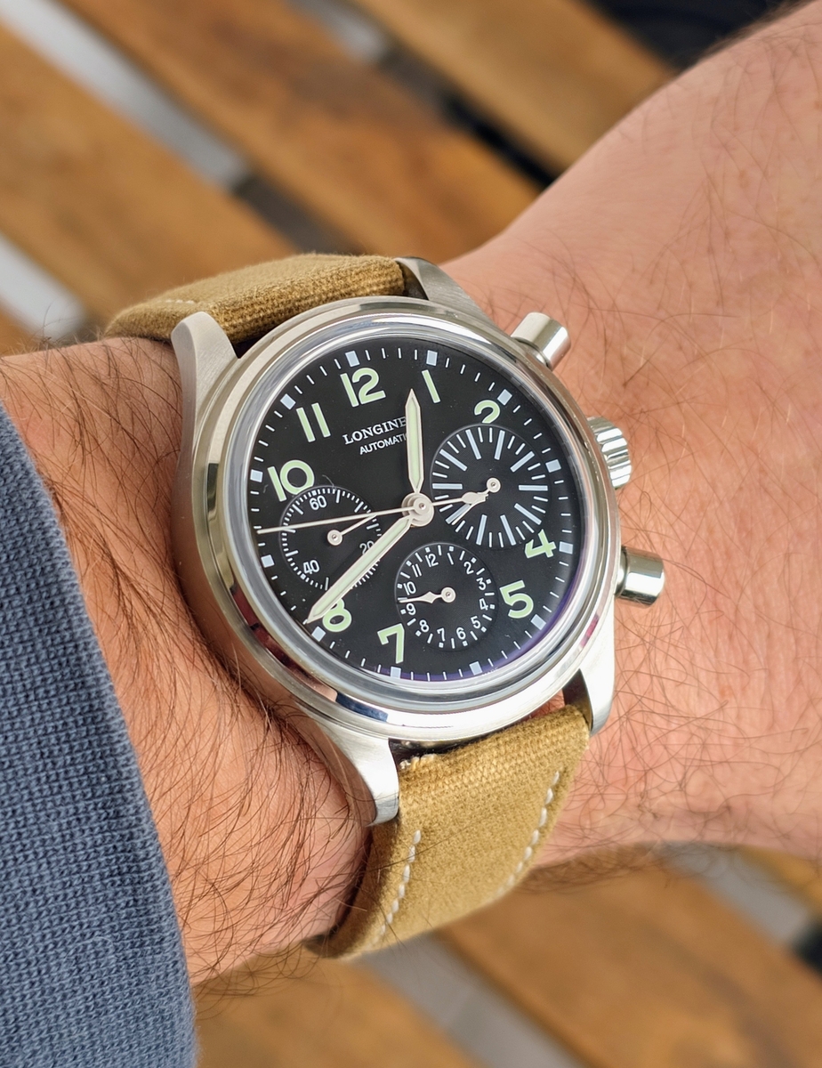 Model jeszcze sprzed zmian tnących koszty, dlatego na pokładzie pracuje Valjoux 7750 ze stop-sekundą i 48h rezerwy chodu, do tego bezel z "kropką" na godz. 12 zamiast trójkąta. Zegarek jest na świetnie pasującym, skórzanym pasku, dodaję również niemal nieużywaną bransoletę H-link (praktycznie żadnych rysek, nawet na zapięciu), która została dokupiona oddzielnie. Stan określam na mocne 8/10, zauważyłem kilka śladów na bezelu oraz na kopercie, również drobnych kilka rysek na dekielku. Hesalitowe szkiełko bez żadnych śladów - czyste.