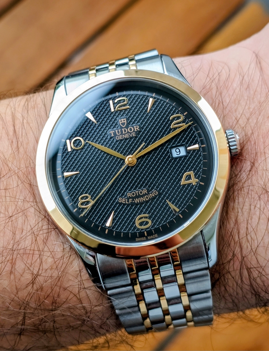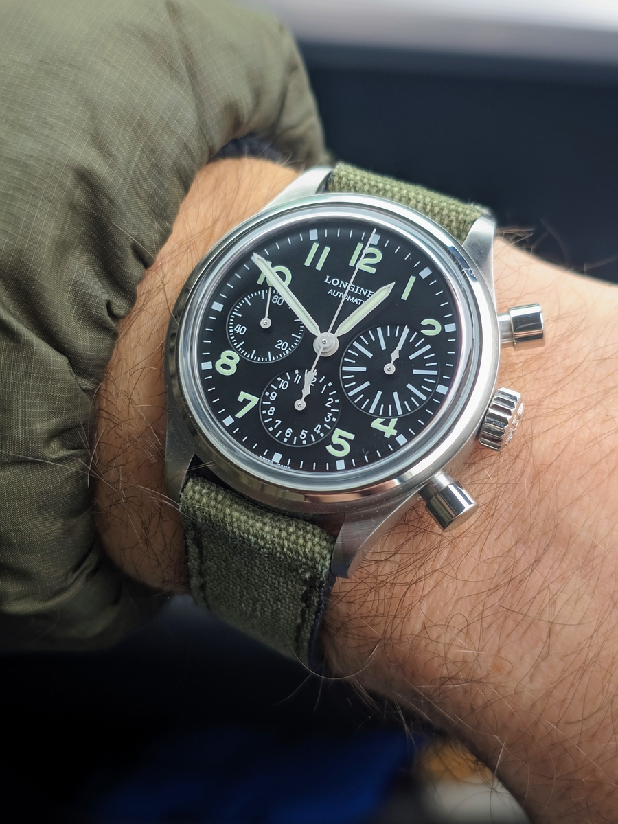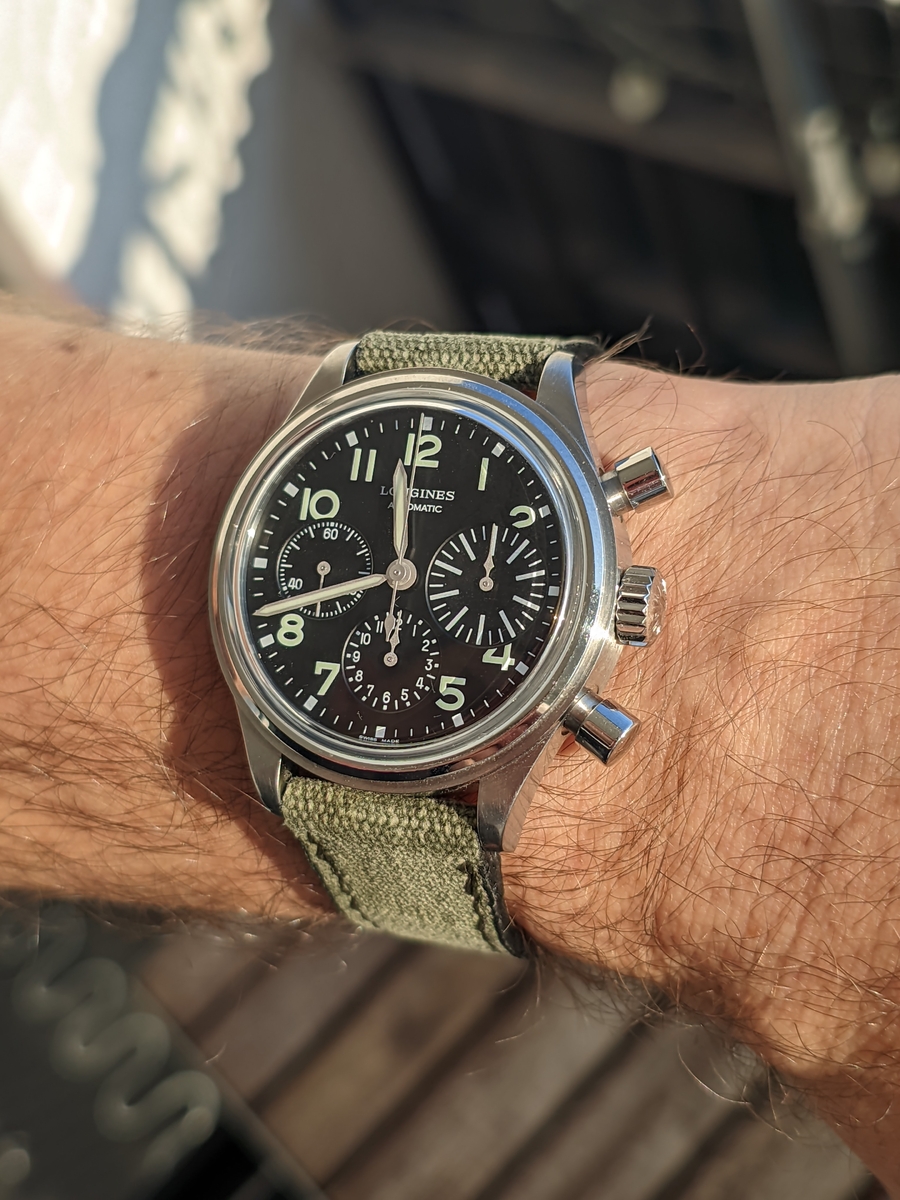 Model jeszcze sprzed zmian tnących koszty, dlatego na pokładzie pracuje Valjoux 7750 ze stop-sekundą i 48h rezerwy chodu, do tego bezel z "kropką" na godz. 12 zamiast trójkąta. Zegarek jest na świetnie pasującym, skórzanym pasku, dodaję również niemal nieużywaną bransoletę H-link (praktycznie żadnych rysek, nawet na zapięciu), która została dokupiona oddzielnie. Stan określam na mocne 8/10, zauważyłem kilka śladów na bezelu oraz na kopercie, również drobnych kilka rysek na dekielku. Hesalitowe szkiełko bez żadnych śladów - czyste.