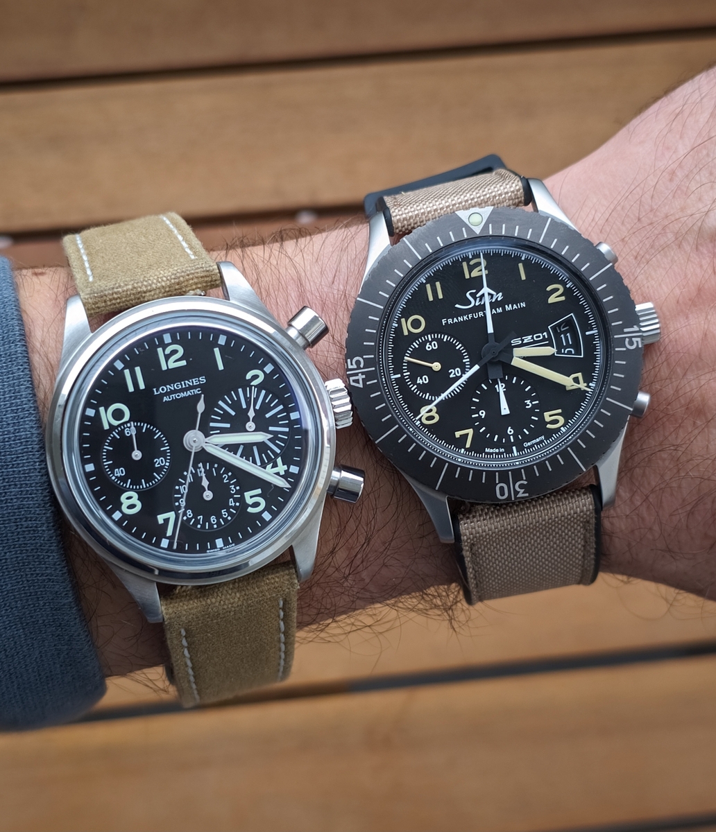 Na sprzedaż leci Sinn 103 St Flieger Chronograph. Model jeszcze sprzed zmian tnących koszty, dlatego na pokładzie pracuje Valjoux 7750 ze stop-sekundą i 48h rezerwy chodu, do tego bezel z "kropką" na godz. 12 zamiast trójkąta. Zegarek jest na świetnie pasującym, skórzanym pasku, dodaję również niemal nieużywaną bransoletę H-link (praktycznie żadnych rysek, nawet na zapięciu), która została dokupiona oddzielnie. Stan określam na mocne 8/10, zauważyłem kilka śladów na bezelu oraz na kopercie, również drobnych kilka rysek na dekielku. Hesalitowe szkiełko bez żadnych śladów - czyste.