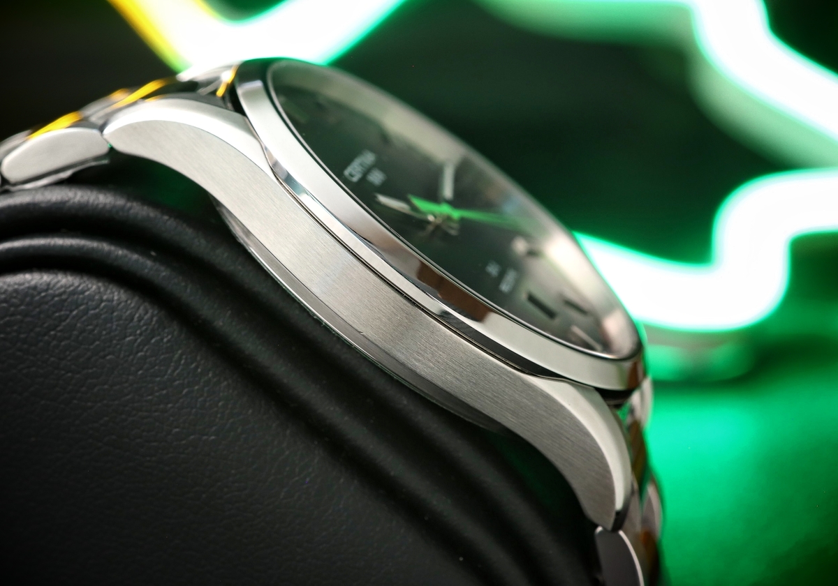 - Koperta: Ze stali szlachetnej. Głównie polerowana, ale w niektórych miejscach (pod bezelem i na dekielku) zdobiona szczotkowaniem.