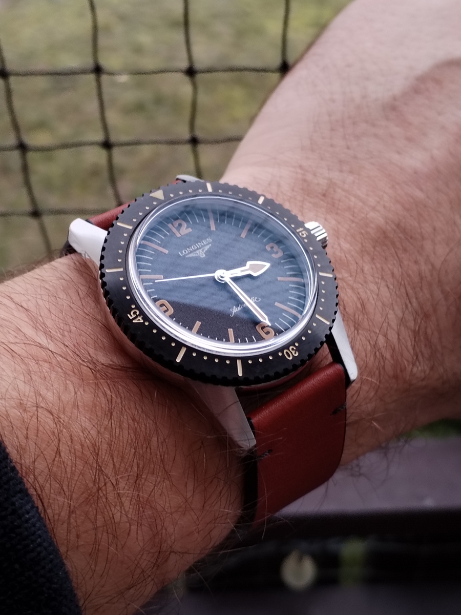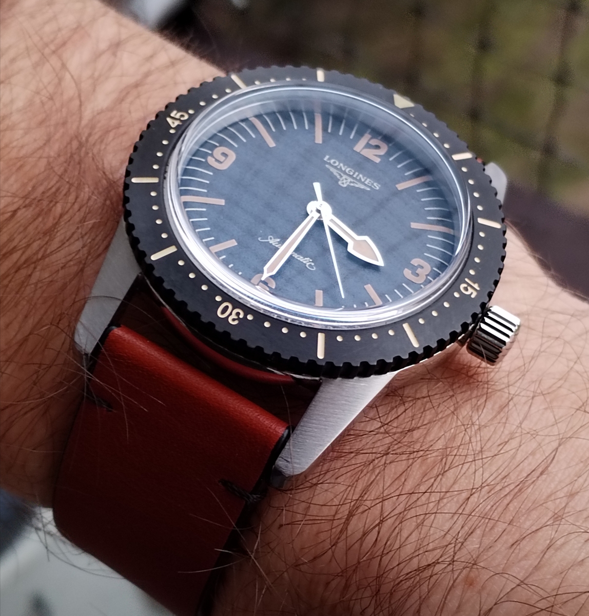 Cieszę się wszelako, że Longines miał w sobie nieco odwagi i w konsekwencji zdecydował się także na wariant o takiej właśnie średnicy koperty, typowej dla zegarków z połowy ubiegłego wieku, a przy okazji przyjaznej dla osób takich jak ja, którzy mają mniejsze nadgarstki. Z kronikarskiej dokładności wspomnieć należy o grubości wynoszącej niecałe 11 mm, a także wymiarze L2L, który wynosi 42 mm. Co dotyczy rozmiarów, to mamy więc typowego garniturowca i to typowego w rozumieniu standardów, które panowały właśnie kilkadziesiąt lat temu. Szkło w tym zegarku to wypukły hesalit (wersja o średnicy koperty 40 mm wyposażona została w szkiełko szafirowe) i to również ukłon w stronę stylistyki vintage, która jest tak bliska mojemu sercu. Wodoodporność tego zegarka to ledwie 30 m, co wszelako nie powinno być żadnym problemem gdy weźmie się pod uwagę przeznaczenie tego zegarka. Odległość między uszami to standardowe 18 mm.