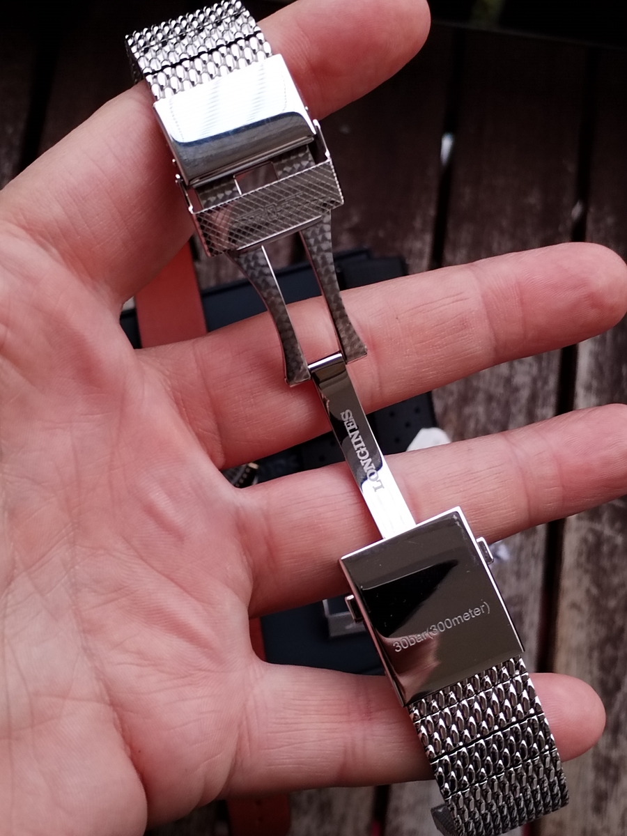 Zegarek pojawił się u mnie na czarnym skórzanym pasku (pasek w mojej ocenie jest całkiem dobrej jakości, odpowiednio gruby oraz miękki), bez jakichkolwiek kontrastowych przeszyć. Uważam, że tak dobrany pasek bardzo dobrze odpowiada charakterowi tego zegarka, choć przez jakiś czas nosiłem ten zegarek na jasnobrązowym zamszowym pasku, żeby ten zegarek nieco odformalizować. Ostatecznie podjąłem jednak decyzję o tym, że zegarek będę traktował jak typowego garniturowca, a w takiej roli lepiej sprawdzi się oryginalny pasek (szerokość przy uszach 18 mm, zwężający się do 16 mm), wyposażony w logowaną klamerkę.
