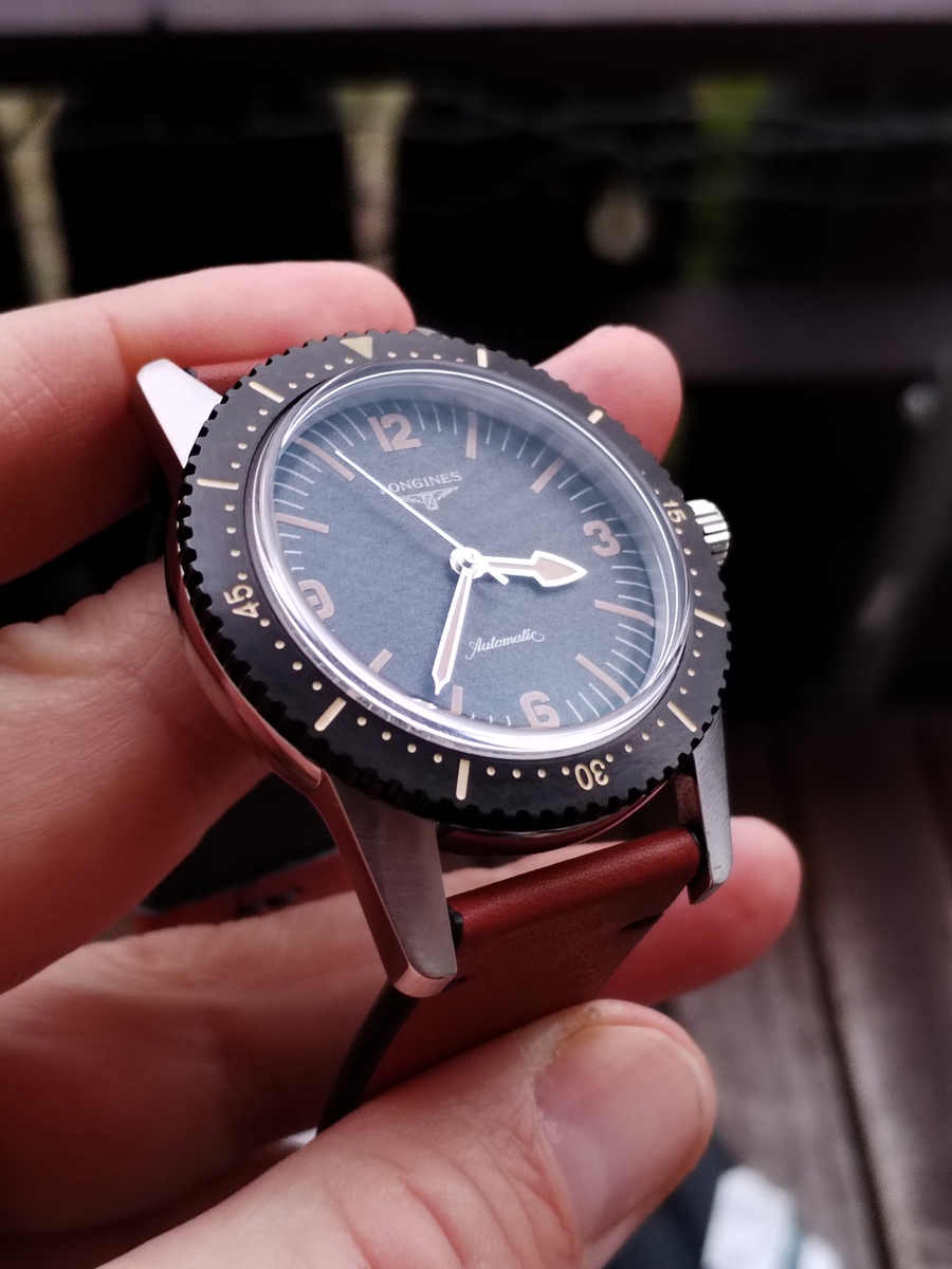 Jeśli ktoś zadałby mi pytanie o to, co najbardziej podoba mi się w tym zegarku, to odpowiedź wydaje się dość oczywista, nawet na podstawie moich nie najlepszej jakości zdjęć, robionych telefonem komórkowym. To tarcza tego zegarka, która w mojej ocenie, zasługuje w zasadzie ca obszerny eleborat. Oczywiście nie mam takich ambicji, więc będzie znacznie krócej. Kolor tarczy w przypadku recenzowanego modelu jest ...trudny do opisania. Tarcza na pewno jest jasna, ale na pewno nie jest to biel czy ecru. Tarcza wpada w kolor srebrny, co dodatkowo potęguje efekt "sunburst", mam nadzieję widoczny na znajdujących się poniżej zdjęciach. Zewnętrzna krawędź tarczy schodzi delikatnie w dół, co przywodzi na myśl tarcze w typie "pie pan". Zegarek ma przepiękne nakładane indeksy w kolorze złotym, na których w zależności od oświetlenia, dzięki wypukłemu hesalitowymu szkłu, pięknie widać grę światła. Te nakładane indeksy, oznaczające poszczególne godziny (takiego nakładanego indeksu nie ma na godz. 12tej, gdzie dość nietypowo umieszczone zostało okienko datownika) to nie zwykłe proste klocki. Każdy indeks to w zasadzie dwa połączone ze sobą wielopłaszczyznowe trójkąty. W niedużym oddaleniu od indeksów godzinowych producent zdecydował się na nałożenie lumy, przy czym prostokąty z lumą są częścią podziałki minutowej. Dodatkowy prostokąt z lumą znajduje się na godz. 12tej, nad okienkiem datownika. Także w przypadku godz. 3ciej oraz 9tej, luma znajduje się na zewnątrz tarczy. Pod godz. 12tą napisy "LONGINES" oraz "AUTOMATIC", a między nimi piękne i nakładane złote logo producenta. Nad godz. 6tą napis "CONQUEST", zaś pod indeksem na godz. 6tej napis "SWISS". Jak pisałem już wcześniej, producent zdecydował się na dość nietypowe umiejscowienie okna z datownikiem, bo na godz. 12tej. Okienko datownika zostało bardzo ładnie wycięte. Tarcza datownika w kolorze białym, a cyfry (liczby) oznaczające poszczególne dni miesiąca w kolorze czarnym. Początkowo byłem dość sceptycznie nastawiony do takiego właśnie umiejscowienia okienka z datownikiem, ale z perspektywy czasu uważam, że takie jego umiejscowienie w żaden sposób nie psuje ogólnej symetrii całej tarczy, a dodatkowo, nadaje temu w sumie bardzo eleganckiemu zegarkowi swoistego "pazura". Wskazówki w mojej ocenie zostały idealnie dobrane do charakteru tego zegarka. To wskazówki w typie dauphine oraz w złotym kolorze, przy czym na wskazówkach godzinowej oraz minutowej znajduje się luma. Całości dopełnia długa i wąska wskazówka sekundnika.