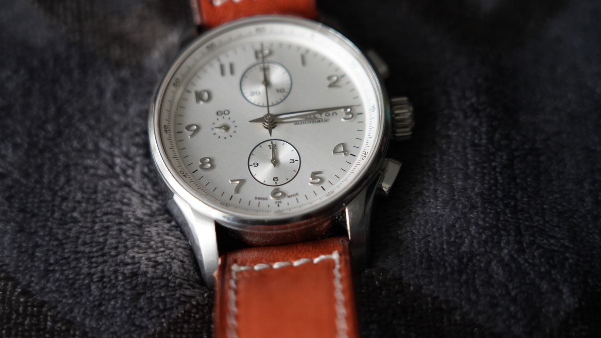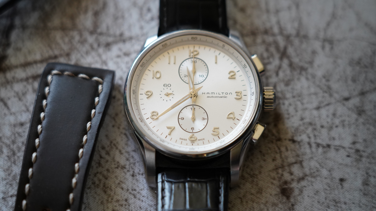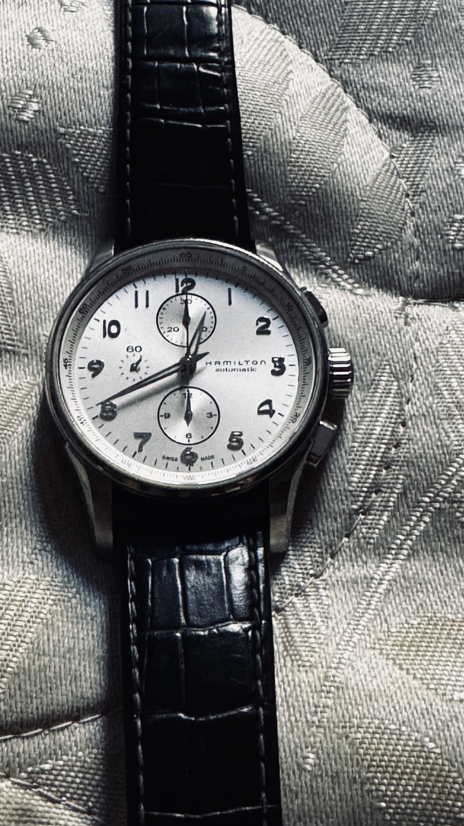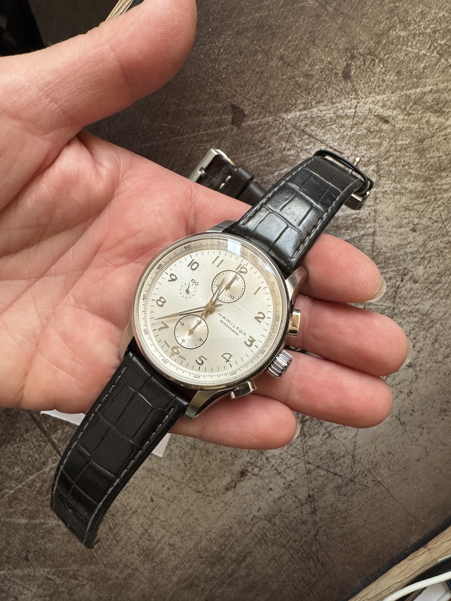 tommly 12032 #1 Napisano Niedziela o 16:12 Wyprzedaży ciąg dalszy: Hamilton Jazzmaster Maestro chrono na werku VJ7750 ref: H327160 Zegarek zakupiony jakiś czas temu na naszym bazarku. W komplecie zegarek i 4 paski: aktualnie założona jest NOWA brązowa koniakowa skóka (foto) + oryginalny czarny skórzany pasek, ciemno-brązowa skórka od jakiegoś paskoroba i nowe nato. Stan wg skali forumowej oceniam na 8/10 - był noszony, więc są jakieś ślady użytkowania, ale nic poważnego. Ściereczka CapeCode powinna poradzić sobie z tym wyśmienicie. Szkło szafirowe czyste. Rozmiar koperty to 45mm, ale nosi się wygodnie nawet na mniejszych nadgarstkach (jak 43mm koperta). Ja mam w chwili obecnej nadgarstek o obwodzie ok. 17,5cm. Tarcza w zależności od światła zmienia barwę od białej, poprzez kremową do srebrnej. Wodoszczelność 100m Szerokość koperty w uszach: 22mm, paski 24 mm (zakrzywione teleskopy). Cena: 2890 zł (koszt wysyłki wliczony w cenę, do wyboru kurier lub paczkomat InPost) We Wrocławiu mile widziany odbiór osobisty. Zapraszam. 0 ..."Wszystko jest możliwe. Niemożliwe po prostu wymaga więcej czasu"... Dan Brown Udostępnij tę odpowiedź Odnośnik do odpowiedzi Udostępnij na innych stronach