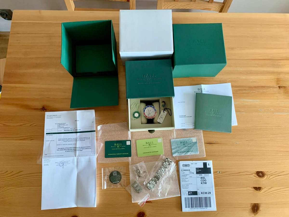 - Zegarek z całym kompletem - widoczne na zdjęciu; bransoletą i paskiem kauczukowym, pudełka, dokumenty,, karty, przywieszki, dowód zakupu (papiery importowe ze Szwajcarii z manufaktury Ball)