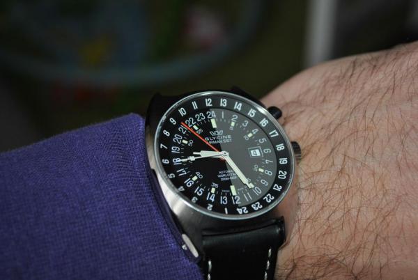 Odnoszac sie do samego wykonania zegarka to wszystko jest jak najbardziej w porzadku, nie ma sie do czego przyczepic. Zegarek prezentuje sie bardzo okazale i rasowo. Co do wielkosci to sprawa ma sie nastepujaco. Zegarek gdy trzymasz go w reku wydaje sie duzy ale jak juz wyladuje na nadgarstku sytuacja sie zmienia. Przede wszystkim swietnie lezy. Nie wiem czy wszyscy sie ze mna zgodza ale Glycine swietnie profiluje koperty. Czy 17'stka czy wlasne Aquarius na nadgarstku wypadaja super wygodnie mimo gabarytow i rozmiar gdzies uchodzi. Jezeli masz 18-18,5 cm w nadgarstku to w mojej opinii powinien lezec idealnie. Rozmiaru nie musisz sie obawiac a wyglada naprawde dobrze. Czarny bezel nadaje sznytu i sferyczny szafir tez robi swoje.