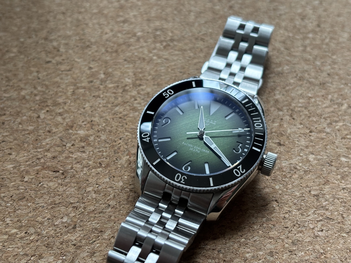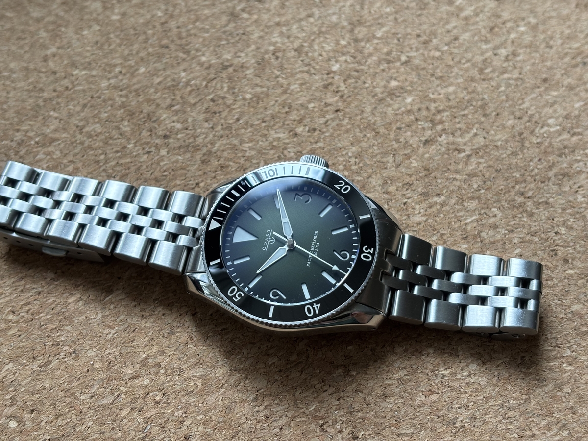 lukkluj 59 #1 Napisano 27 Marca Na sprzedaż mam coś rzadko spotykanego, czyli model Pacific Explorer duńskiego mikrobrandu Coast. Mamy tu świetne wymiary: 39mm bez koronki, 46,5mm L2L, 12mm grubości i 20mm w uszach. Ceramiczny bezel + bardzo zacny szafir. W środku cyka Selitta SW-200, oczywiście na dobrym chodzie. Uwagę zwraca ciemnozielona tarcza, która jest połączenia metalicznej szczotki z efektem fume. Patrząc na wprost jest prawie czarna, a jak dostanie światła z boku, to zaczyna się piękne wydobywanie koloru Do tego indeksy kanapkowe z całkiem solidną lumą (Super-LumiNova C1-X1). Jednym słowem - bardzo dobre specyfikacje. WR200, zakręcana koronka. W zestawie jest zegarek na bransie, czarny pasek tropik niezłej jakości i bardzo fajne etui camo z zamszu sygnowane przez Coast. Zegarek jest w stanie 8-9/10. Ewidentnie bardzo mało noszony. Na moją tłustą (18,5cm) łapę okazał się ciut za mały. Jak ktoś ma 17,5 lub mniej, to będzie pewnie idealny. CENA: 1600 PLN + paczkomat 0 Udostępnij tę odpowiedź Odnośnik do odpowiedzi Udostępnij na innych stronach
