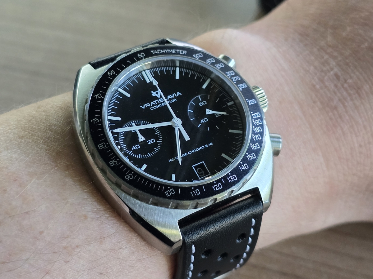 Na godzinie 3ciej, garanatowa to subtarcza minutowa chronografu, odlicza minuty kiedy uruchomimy czerwoną wskazówkę tachometru z gwiazdą.