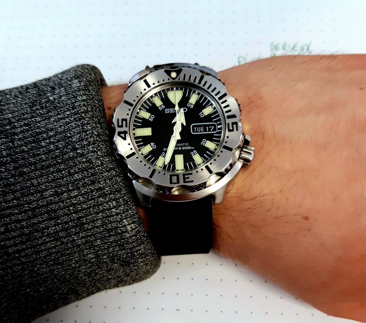 Wlazł jesienią na nadgarstek i nie daje się wygonić. Koszula wystrzępiona ale do domu i na spacer z pieskiem, jeszcze może być 😉