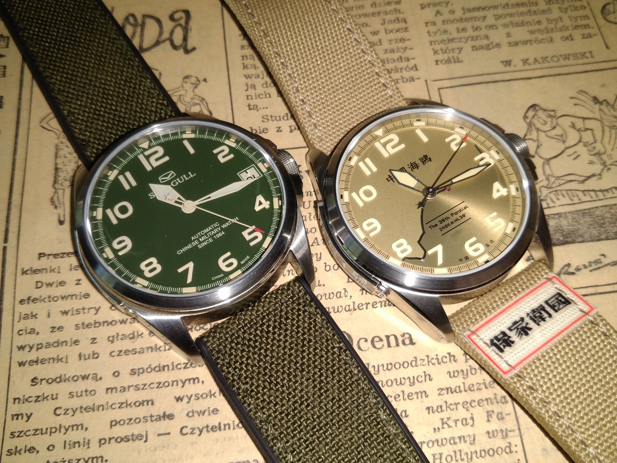 Oba zegarki mimo dużego podobieństwa tarczy, różnią się mechanizmem i WR. Zielony ma datownik i niedokręcaną koronkę a tym samym WR 50m. Złoty nie ma datownika, ale ma dokręcaną koronkę i WR 100m. Na szczęście nie ma tzw. ghost position. Polecam oba, bo mają w sobie to "coś" i przez to u mnie nie skończyło się na jednym modelu.