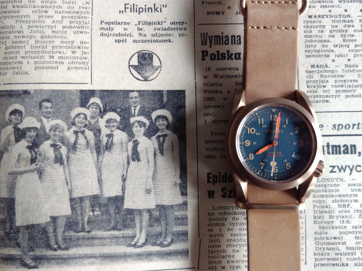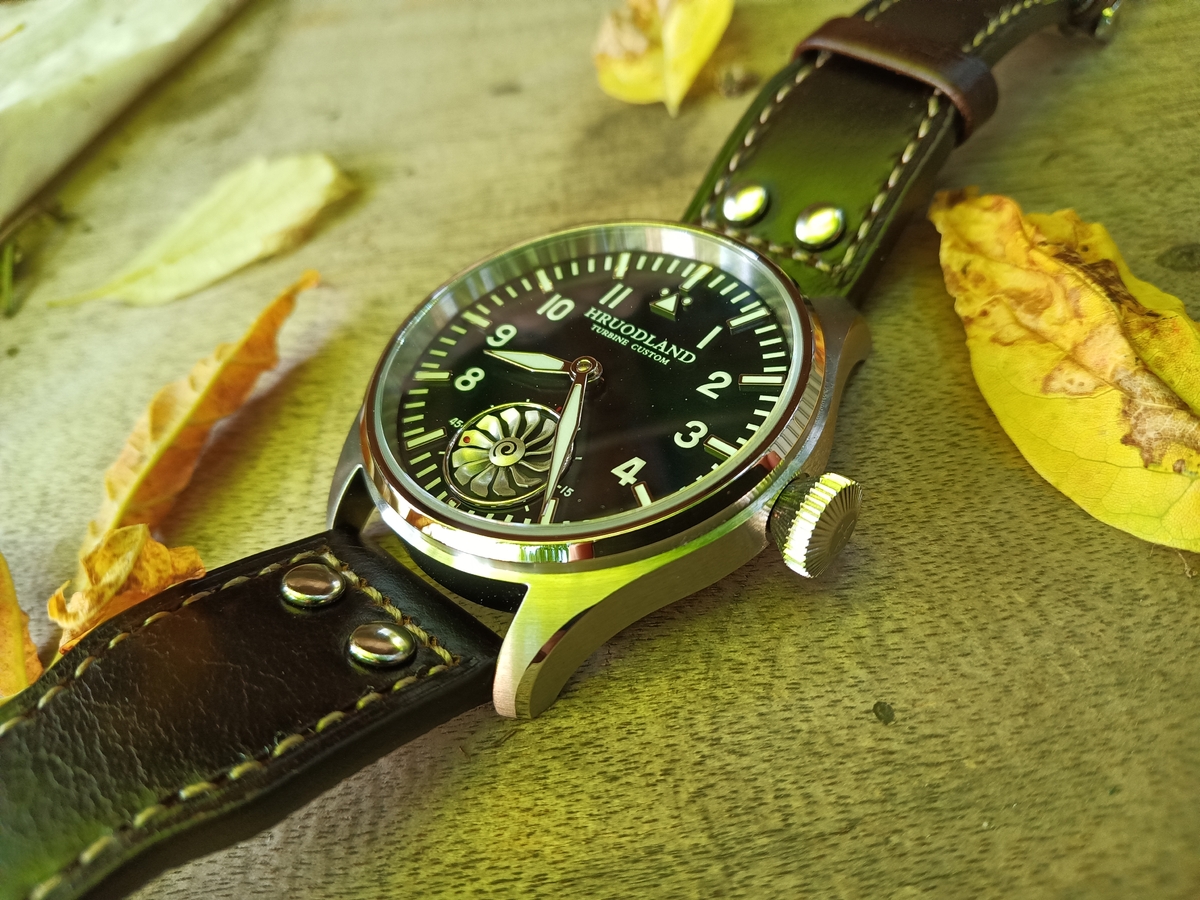Wszystkie elementy metalowe są z brązu. Nie jestem zwolennikiem patyny a tym bardziej patynowania. Zegarek dobrze wykonany, choć na pasku ze skóry układa się dosyć "wysoko".