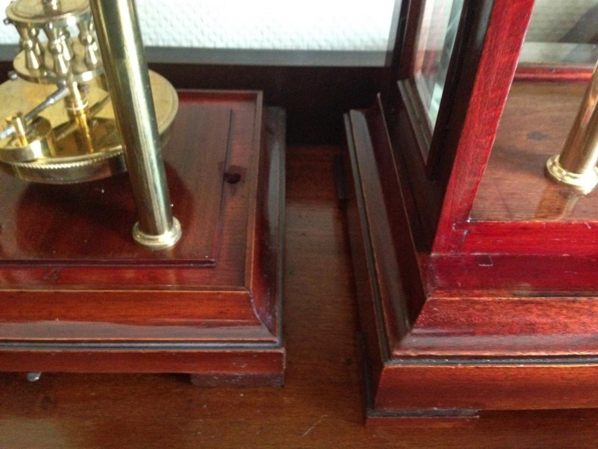 Po odkręceniu dwóch wkrętów od spodu obudowy możesz zdjąć całą witrynę. W ten sposób uzyskujesz dostęp do powierzchni podstawy i możesz doprowadzić ją do stanu idealnego. Gdyby obudowy miały być kołkowane w fabryce, to tak by postąpiono. Widziałem wiele pleców w zegarach wiszących, gdzie z powodu oryginalnego wzoru słojów uzupełniano wady forniru wstawkami, które dla niewprawnego oka były nie do znalezienia. Z kolei inne przebarwienia na mahoniowych obudowach to efekt wielokrotnego ścierania kurzu, ale te wyglądają inaczej.