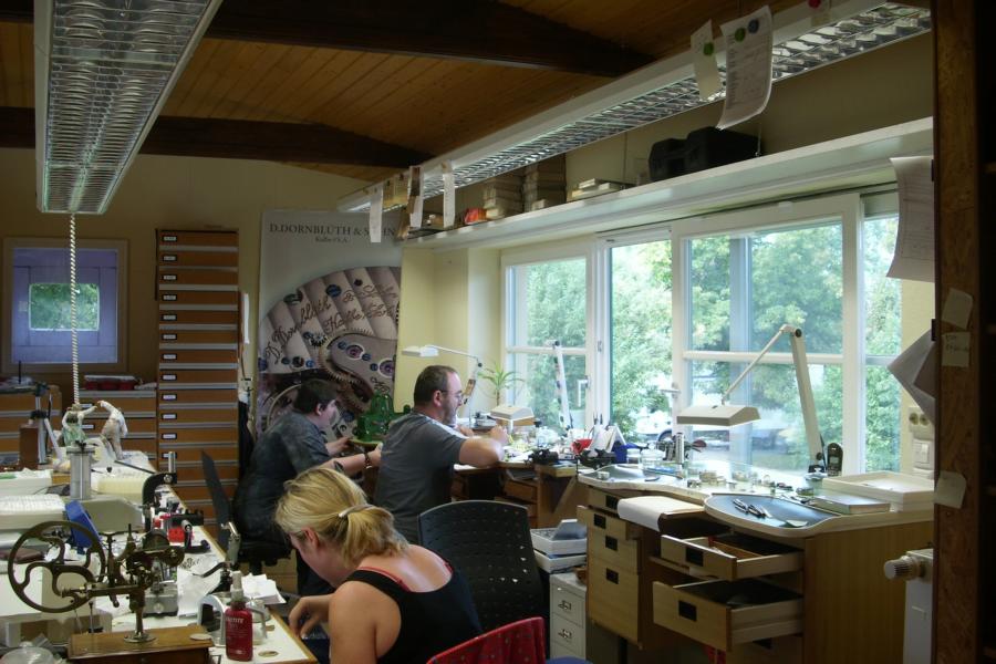 Ale wracając do tematu. Dornbluth to zegarek w stylu szkoły Glashutte znanym z firm z rejonu Saksonii. Na pierwszy rzut oka można zauważyć cechy, które spotkamy we wszystkich zegarkach tego typu: płyta 3/4, szlify: paski genewskie na płycie i ślimakowe na kołach zębatych, grawer na mostku, kamienie w złotych szatonach. Ponadto cała płyta zegarka i mostki jest robiona od podstaw z unitasa montowane są koła zębate, bęben sprężyny, balans etc. W cały werk jest włożone sporo pracy i ręcznego zdobienia. Tarcze również są wykonywane w warsztacie Dirka ręcznie i srebrzone ( białe tarcze są emaliowanie ).
