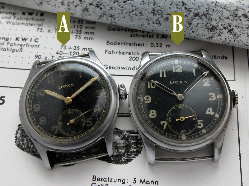 Po lewej typ A, z lumą na cyfrach, po prawej typ B z kropkami lumy (poczerniała, zachowała się tylko po lewej stronie tarczy). Zdaję sobie sprawę że coś tam było grzebane ze wskazówkami, ale z tego co znalazłem zdaje się że, nietypowo dla wojskowych, przynajmniej w niektórych Doksach DH były montowane złocone.