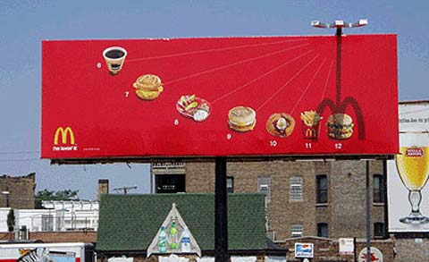 Znalazłem takie zabawne COŚ :lol: W Stanach firma McD zrobiła billboard w formie zegara słonecznego. Gnomon, na którego końcu umieszczono logo owej firmy, wskazuje cieniem polecane do spożycia potrawy na daną porę dnia. Jajcarze :lol:
