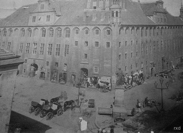 50 [Poznań] Ratusz Staromiejski. Zegarek bardzo niepasujący wyglądem i gabarytami do miejsca, w którym go umieszczono. Sądzę, że aby odczytać na nim czas ludzie potrzebowali lornetek, których kiedyś za wiele nie mieli :P Reprint starej pocztówki dowodził jednak, że zegarek jest na Ratuszu od bardzo dawna.