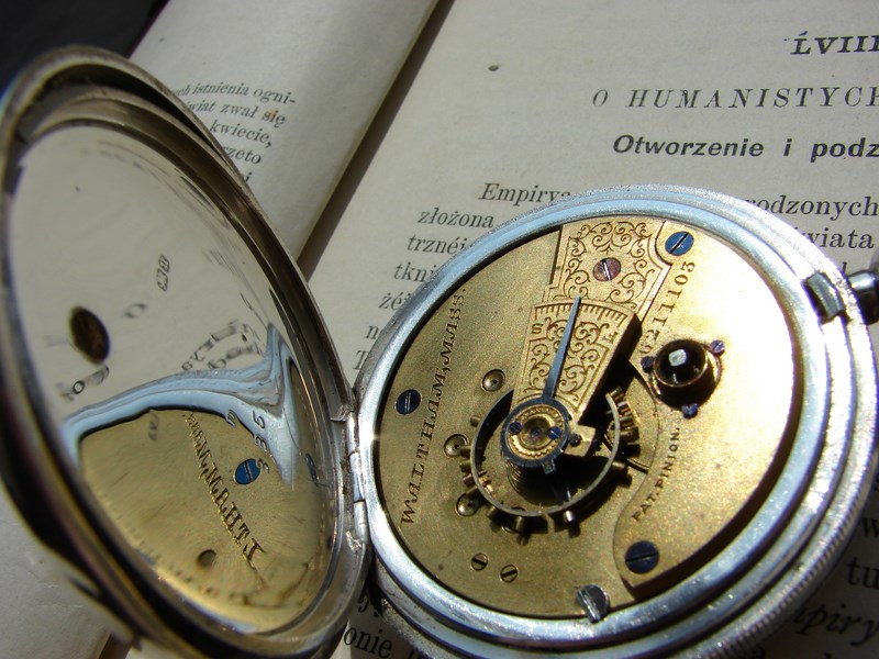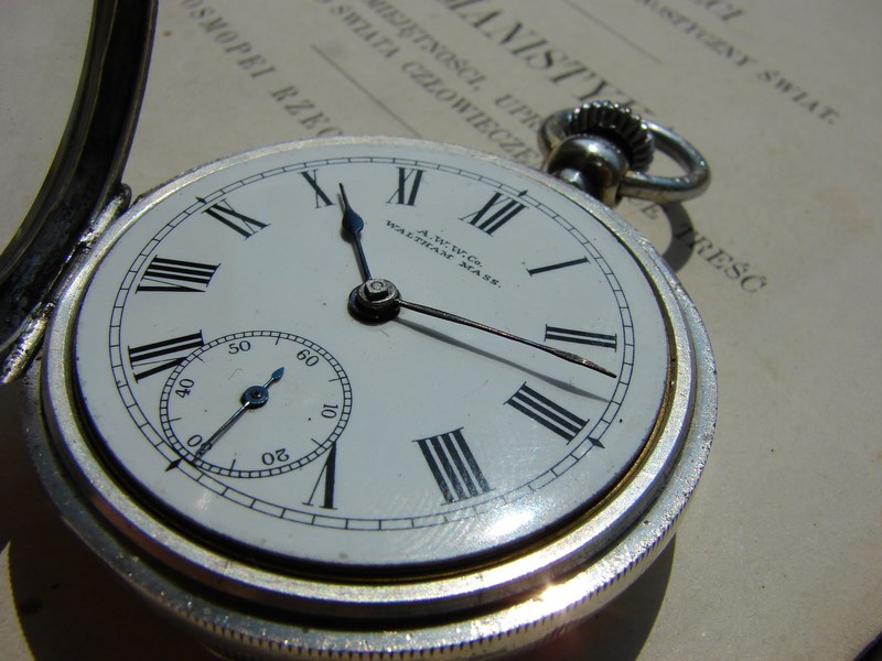 Mój pierwszy amerykaniec. Szukałem koniecznie Waltham'a i w końcu trafił się chyba całkiem niezły, w srebrnej kopercie. Rocznikowo - młodziak - według numeru seryjnego wyprodukowany ok. 1892 roku, więc ma zaledwie 121 lat :)