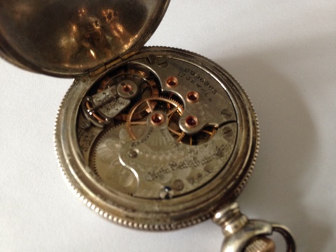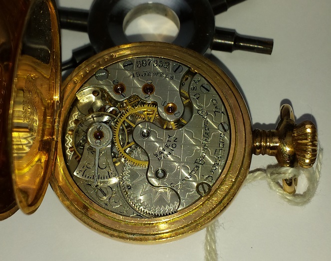Mój Veritas niestety zaginął - nie wiem, co się dzieje, sprzedawca milczy, zegarka nie ma :( Jest natomiast inne cudo z Elgin, grade 176 z końca XIX wieku, najwyższy model damskiego mechanizmu rozmiaru 6. Łączna produkcja 2600szt - nie mało ale i nie dużo, piękne wykończenia ze złotymi śrubkami balansu, złotymi, uniesionymi szatonami, mikroregulacją i cudownymi kołami przekładni i wychwytu - wszystkie złote z fazowanymi krawędziami. Całość wsadziłem do srebrnej koperty Illinois (z epoki, ale pierwotnie przeznaczona dla mechanizmu z dźwignią...). Sorki za jakość zdjęć, moje baterie do aparatu niestety zdechły na amen i póki co (tzn. aż nie rusze czterech liter do sklepu) mam tylko telefon...
