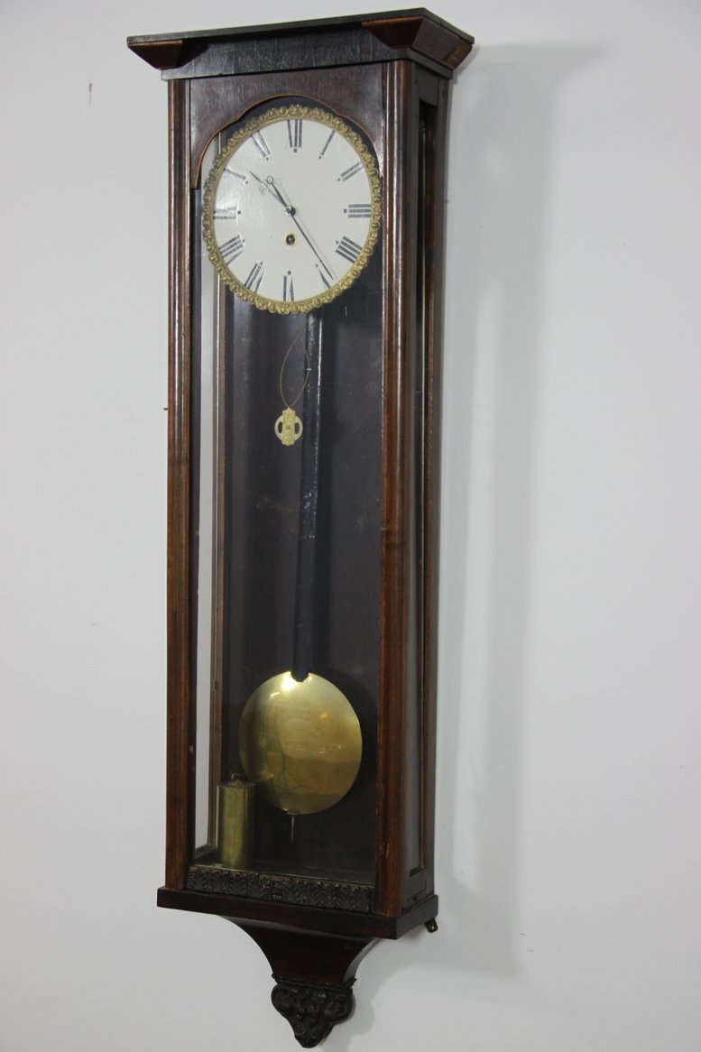 Piotr Ratyński 407 #167 Napisano 28 Lipca 2012 Tak ostatnio się zastanawiałem nad tarczami zegarów z okresu biedermeier z Wiednia. Czy komuś z kolegów jest wiadoma jakaś konkretna data kiedy pojawiły się tarcze dzielone w tego typu zegarach.Konkretnej daty od kiedy w zegarach wiedeńskich pojawiły się dzielone tarcze nie znam, ale w pierwszej połowie XIX w. się zdarzają, a w drugiej to nawet często. Jako przykład dam ciekawy zegar z 1800 roku. Dziwi mnie , że jest metalowy prent wahadła a raczej powinien być drewniany.Stalowe pręty wahadła są częste w zegarach wiedeńskich i jeżeli chodzi o oryginalność zegara to taki pręt świadczy na plus (ale pewności oczywiście nie daje). 0 Piotr Ratyński Adhibe rationem difficultatibus. Udostępnij tę odpowiedź Odnośnik do odpowiedzi Udostępnij na innych stronach