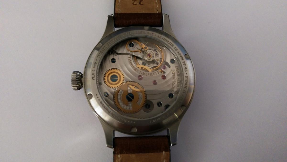 Fajny, duży lub można powiedzieć odpowiedni dla pilota. Rewelacyjne jest wypukłe szkło, tarcza niby prosta czarna ale matowa no i sandwich co też dodaje sporo smaczku. Cofnięta, wklęsła tarcza sekundnika też robi swoje, Wskazówki są o tyle ciekawe że patrząc idealnie na wprost wyglądają że obwódka jest czarna a patrząc pod kątem widać że jednak są połyskujące niebieskie. Zdobienie mechanizmu.... ahhh...coś pięknego. Nie sprawdzałem jeszcze dokładności bo mam go dopiero 2 dzień na ręku ale sądze że nie będzie odbiegać niczym specjalnym od Unitasa 6497-1 na którym bazuje. Ależ on pięknie i głośno tyka!