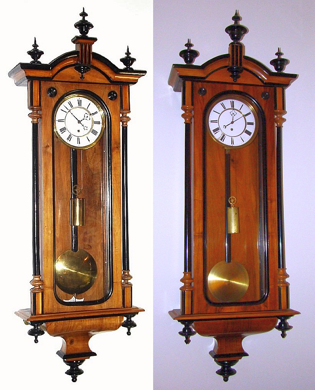 WueM 120 #159 Napisano 21 Listopada 2011 Ano tak że starano sie uzyskać symetryczny wzór przebarwień, układu slojów itp (dotyczyło to zarówno orzecha jak i dębiny mahoniu itp) na skrzyni i dlatego fornir był łączony w osi jej symetriii.To o czym piszesz, tzn. łączenie forniru i szukanie symetrii przypisałbym stylowi Altdeutsche, wcześniejsze skrzynie, utrzymane nawet w stylu przejściowym, nie miały zbyt wielu fornirowanych elementów. Stosowano głównie obłóg (boki skrzyni, drzwiczki) a fornir na plecach nierzadko występował w postaci pojedynczego liścia. Broda, jeśli miała fornir to nie był łączony. Myślę, że potrzeba było trochę czasu aby opanować technikę łączenia forniru w skosy. Prezentowany wyżej zegar ma ładnie zestawione usłojenie górki z drzwiczkami, szukałbym kontynuacji na brodzie. Ciągle mam na myśli zegary z trzeciej ćwierci XIX wieku, np. taka wiedeńska parka w stylu transitional: 0 Wojtek + Certina Club 2000 od lat Udostępnij tę odpowiedź Odnośnik do odpowiedzi Udostępnij na innych stronach