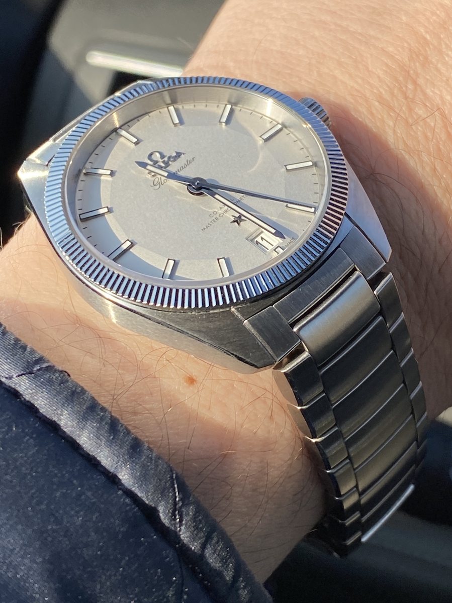 Odbiór Globemastera jest mocno uzależniony według mnie od oświetlenia, czy to zewnętrznego czy wewnętrznego - wiosną i latem na zewnątrz super wrażenie takiego rozświetlenia (zarówno tarcza jak i bezel), w pomieszczeniach napewno traci. Po tych 11 miesiącach używania w miarę regularnego (choć w rotacji jeszcze z 4 innymi zegarkami) wizualnie wygląda naprawdę świetnie, ale to dlatego że tutaj elementów typowo polerowanych jest bardzo mało, jedynie fazowanie krawędzi na kopercie, szczotkowanie bransolety i dość małe ogniwa jakoś to wszystko ukrywają (choć rysy jakieś normalne oczywiście są).