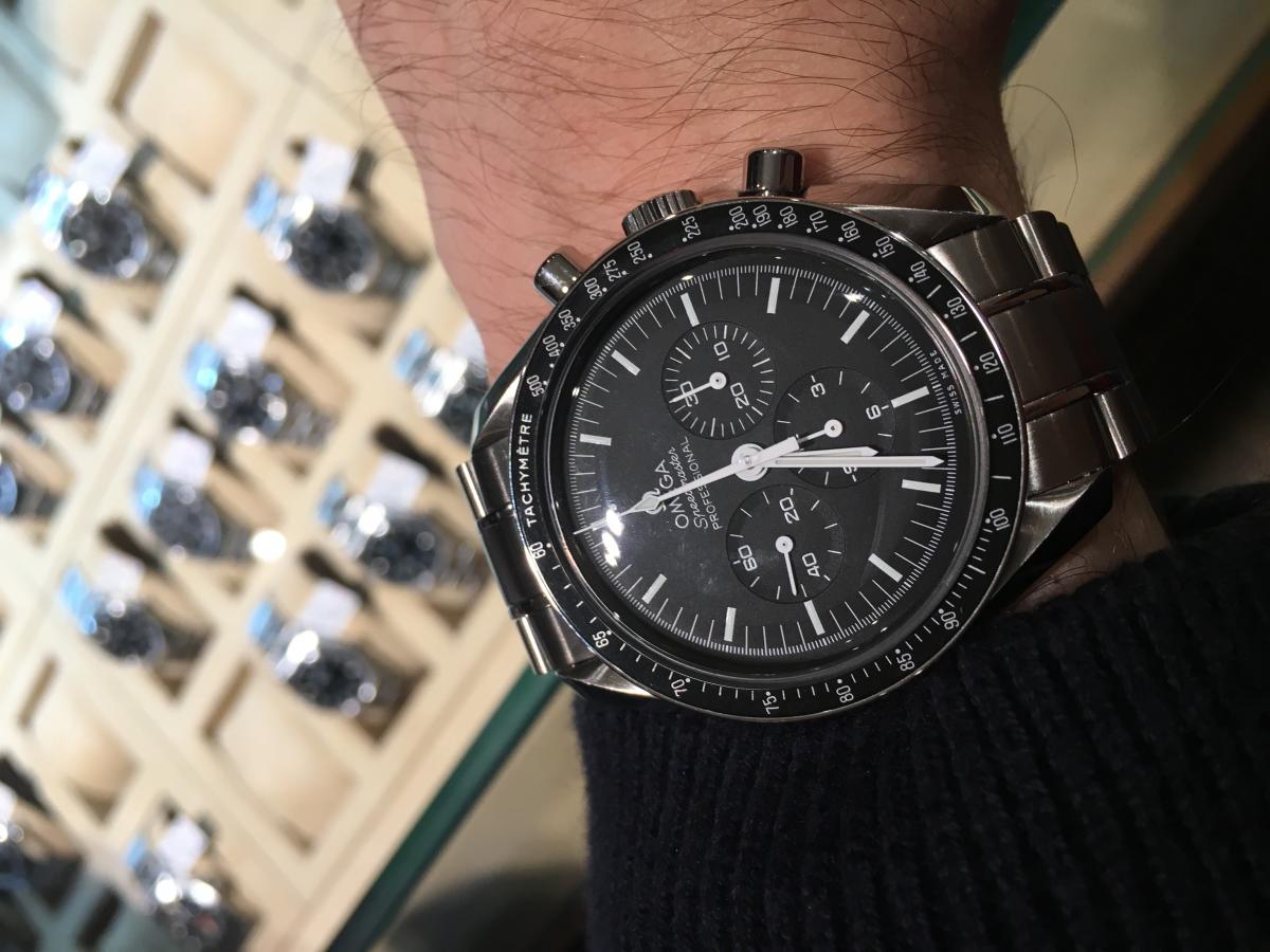 ii. Jesli Moonwatch, to kupic hesalite czy sapphire. Sapphire wydaje sie bardziej praktyczny (zadrapania etc.), ale hesalite jest czesciej polecany jako ten "original moonwatch". Na zdjeciach mam oba - dzieki szafirze tarcza jest chyba lepiej widoczna, ale hesalite tez ma swoj urok.