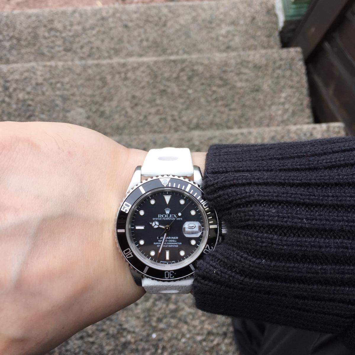 Większość zdjęć w necie na białej gumie dotyczy jasnych tarcz, głównie damskich zegarków ale znalazłem też „spektakularny” przykład tego połączenia ;-) mnie się nie podoba a Ty oceń sam