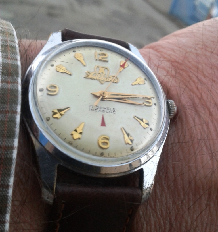 Pawel2499 147 #4122 Napisano 2 Stycznia 2014 mój zakup trochę w ciemno, taki składaczek ale wydaje się zadowolony że dostał drugą szanse tak wyglądał u poprzedniego właściciela: to zobaczyłem po odkręceniu dekielka, jeśli się prof. Google nie myli to chyba kaliber 12.68N a rok produkcji 1943 a tak wygląda ze wskazówkami z odzysku i na razie na zastępczym pasku, ale myślę że zasłuży niedługo na coś egzotycznego pozdr.Paweł 0 Udostępnij tę odpowiedź Odnośnik do odpowiedzi Udostępnij na innych stronach